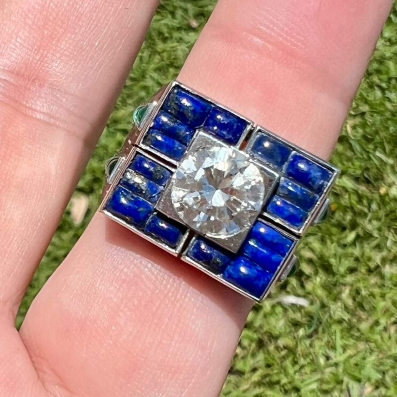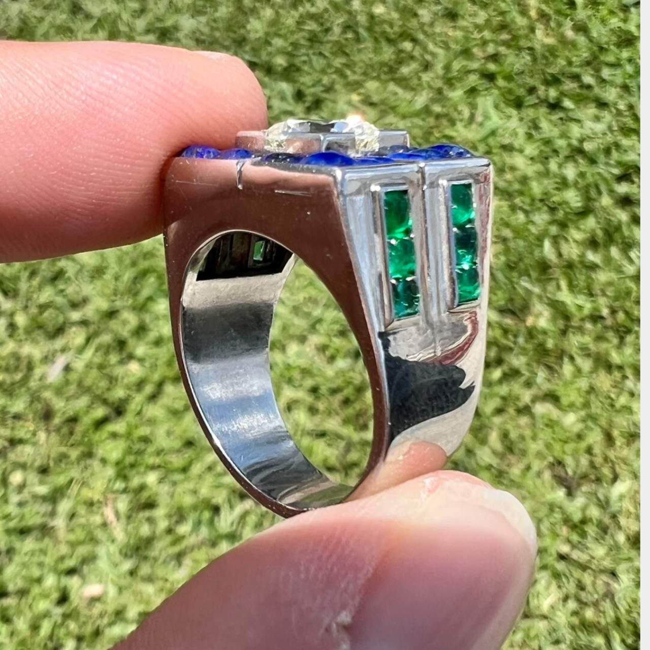 Art Deco Platinum Diamond, Emerald, & Lapis Lazuli RingWeighing 16.9 grams