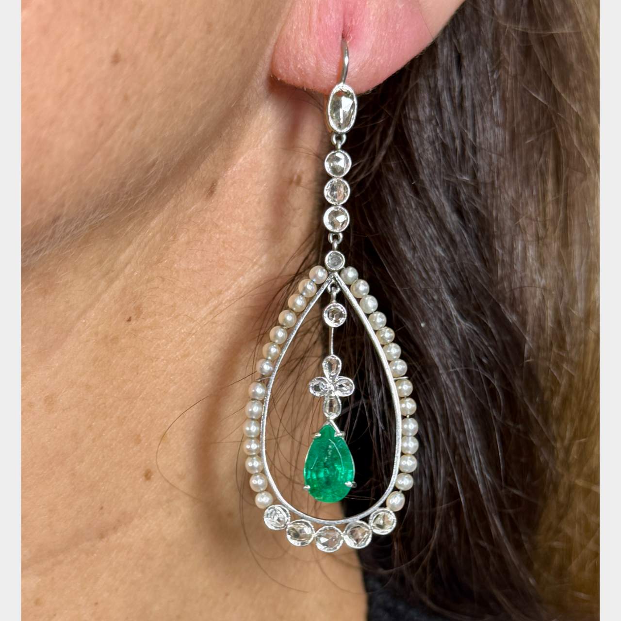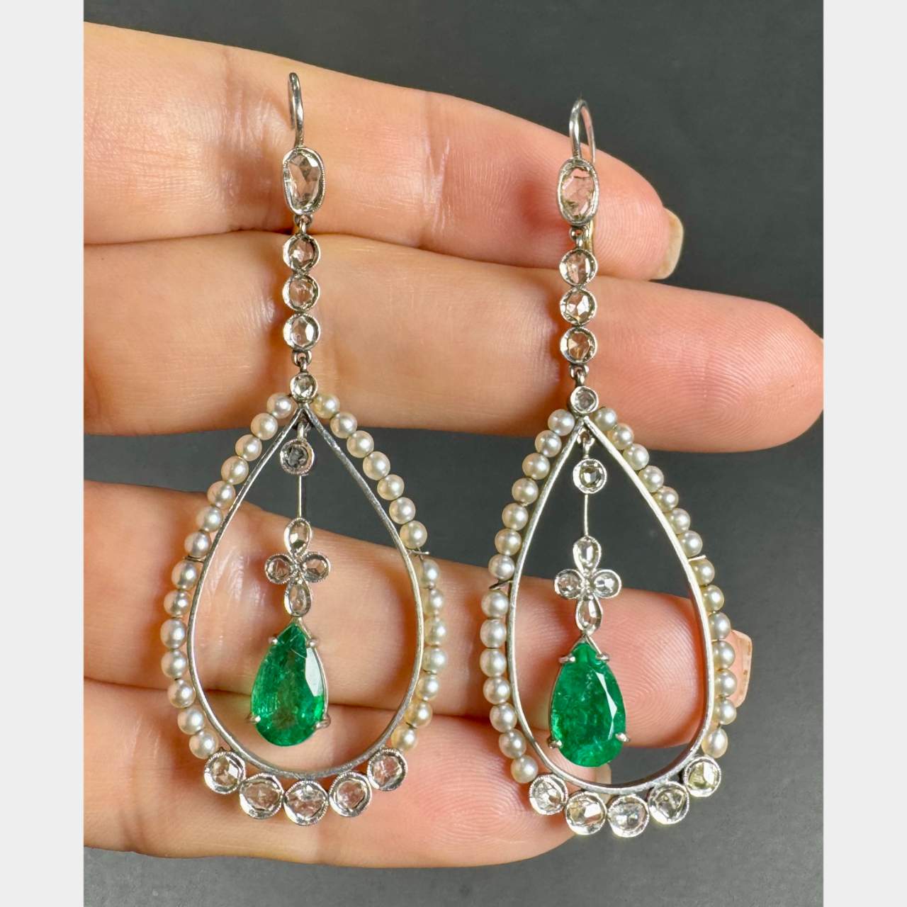 Antique Platinum & 18K Emerald Diamond and Natural Pearl EarringsWeighing 12.2 grams