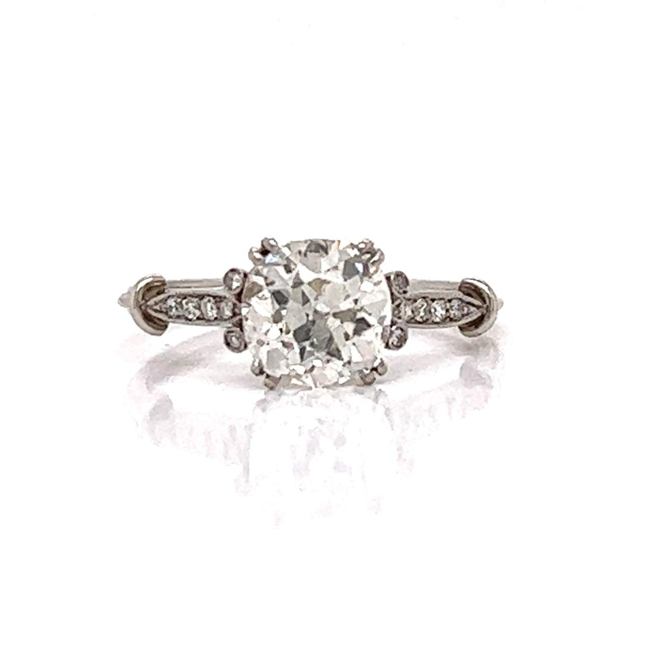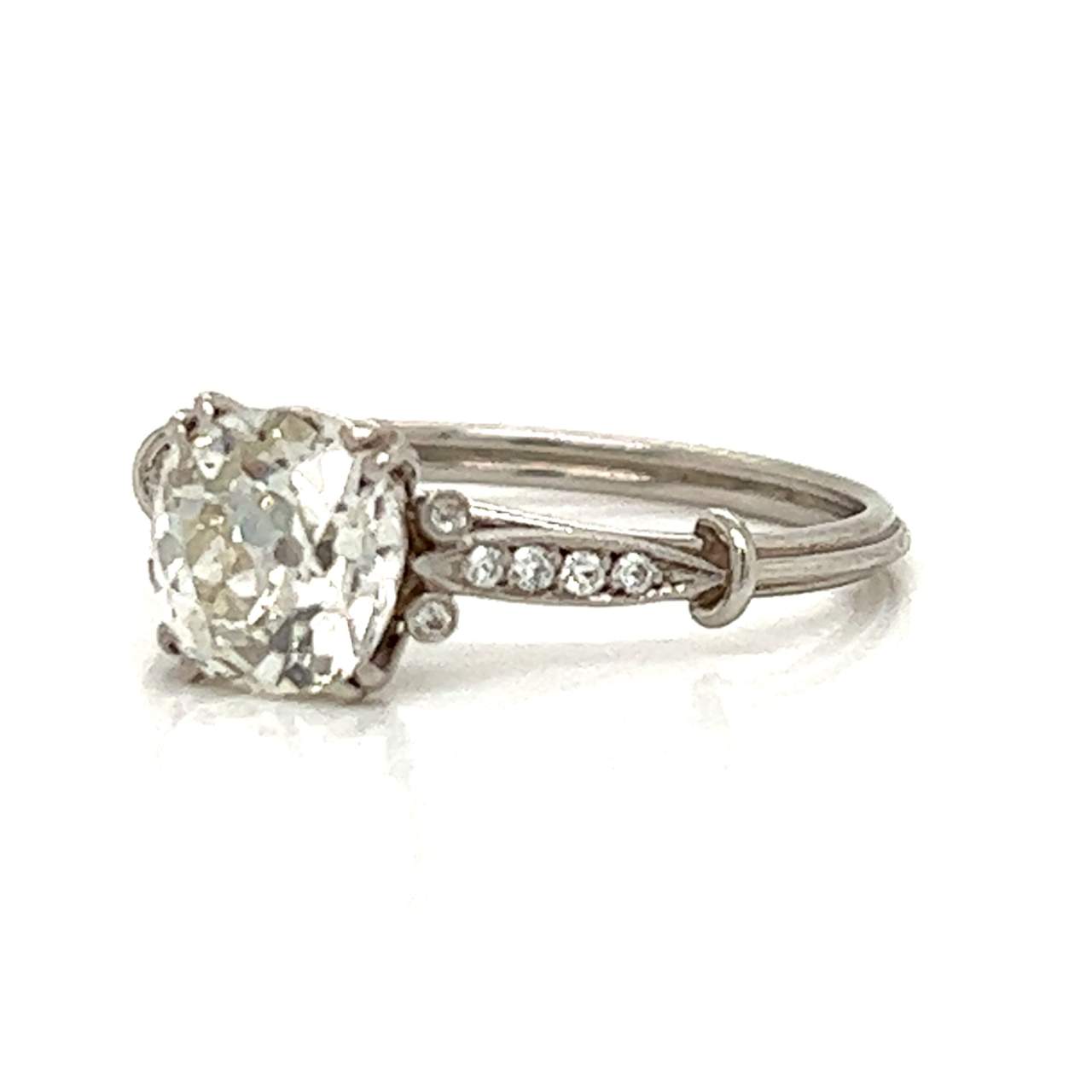 Platinum 1.50 Ct. Diamond Engagement RingWeighing 2.9 gramsSet with an app. 1.50 Ct. Cushion-cut Diamond in CenterI-J Color, SI2 ClarityAlong with 12 Diamonds set in Mounting weighing app. 0.08 Ct.Ring Size 6