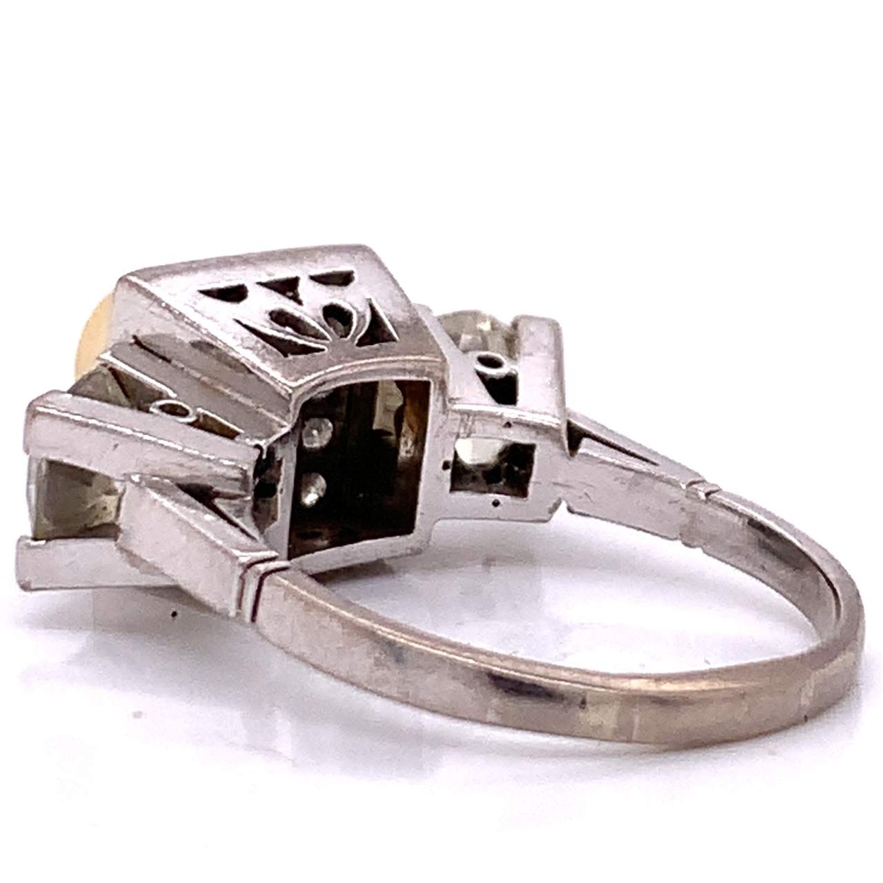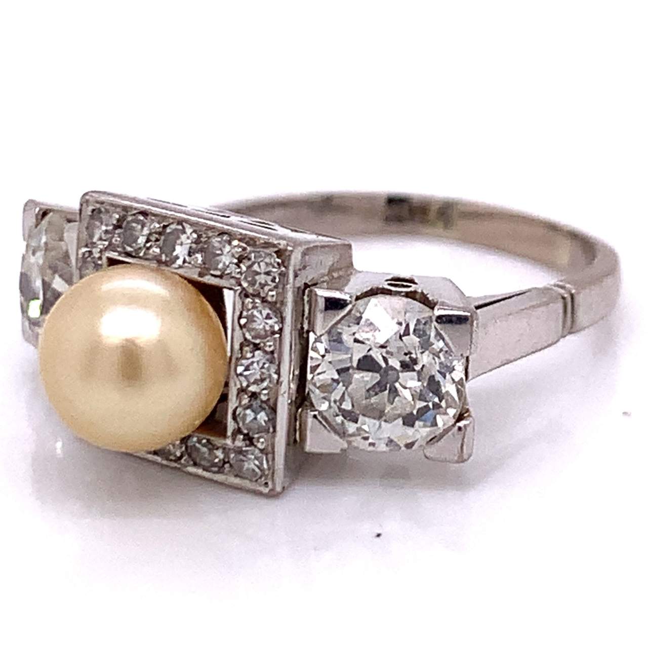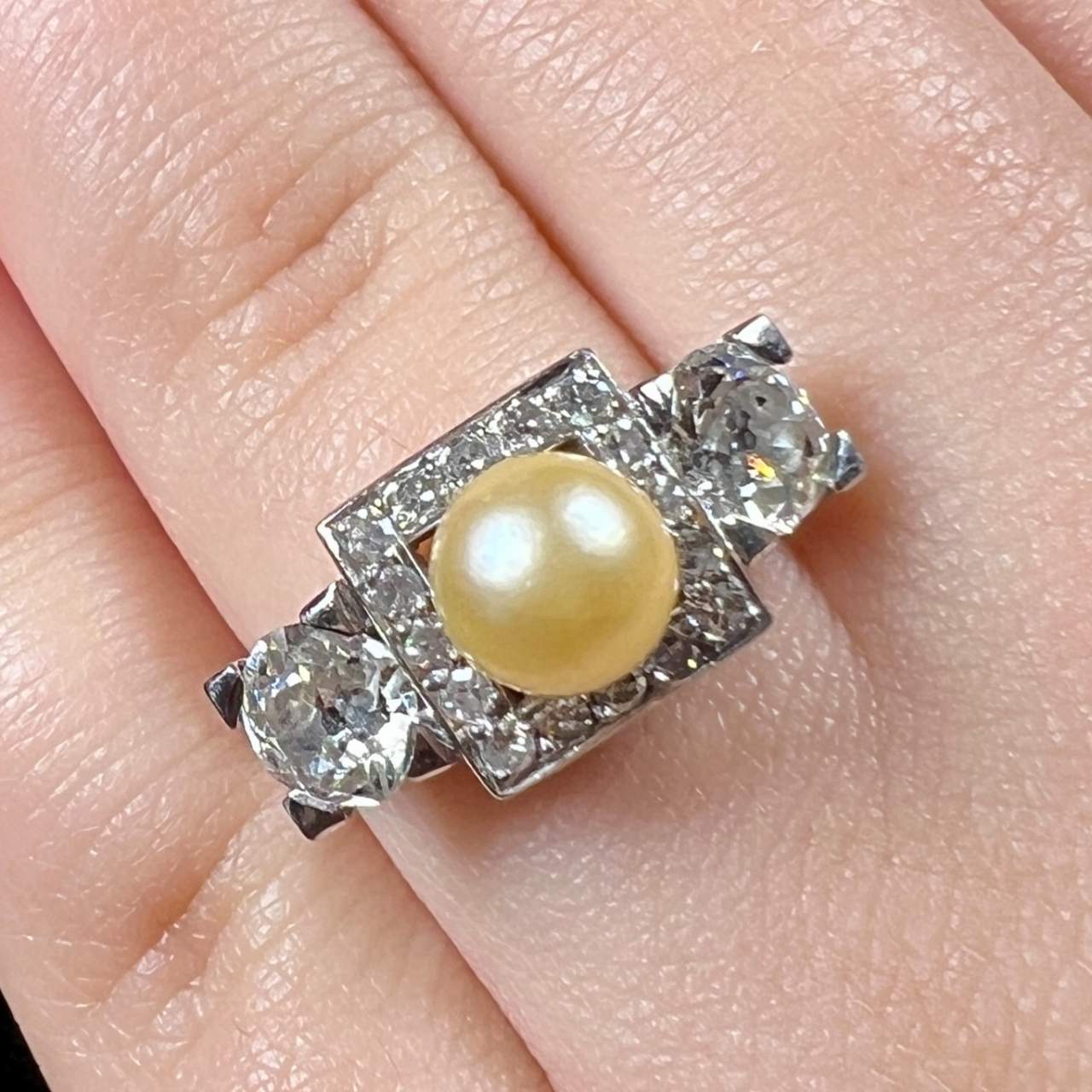 Art Deco Platinum Natural Pearl and Diamond RingWeighing 6.6 grams