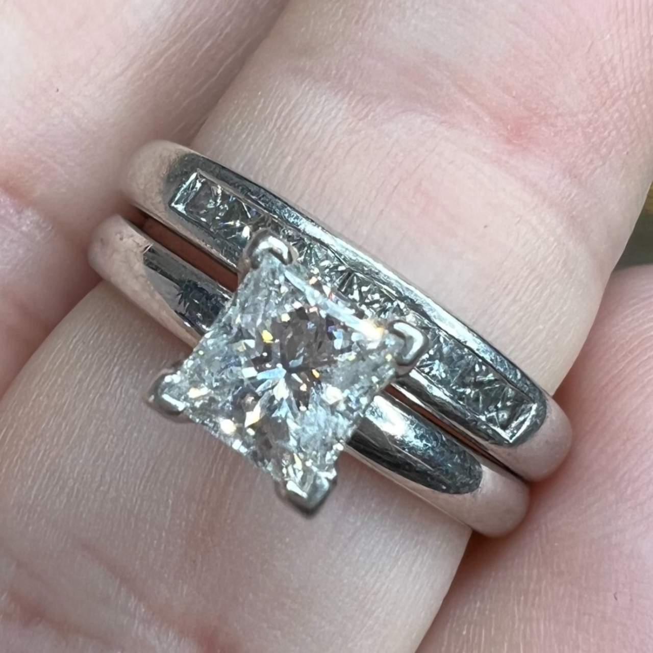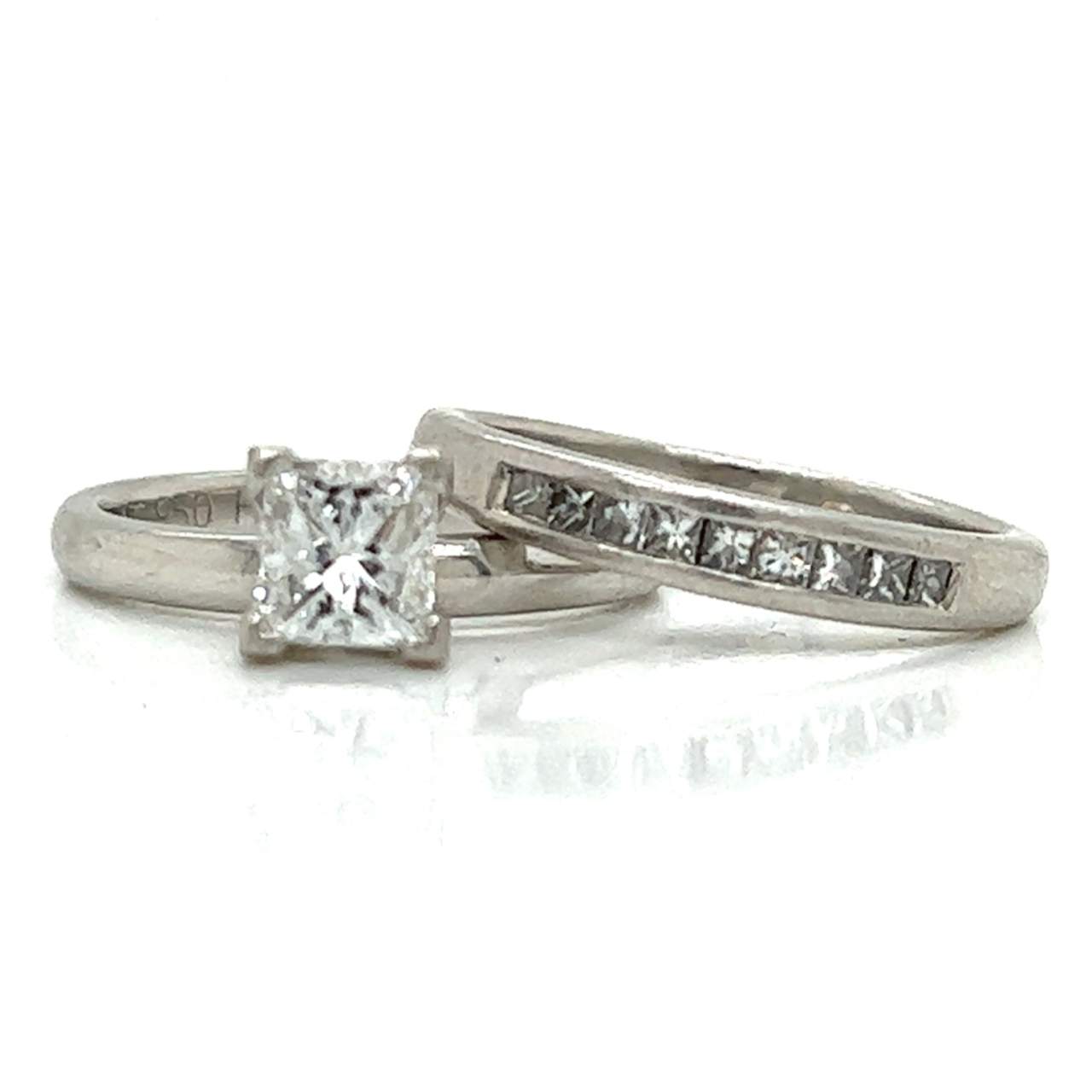 Platinum Diamond Ring & Band SetWeighing 8.1 gramsSet with a GIA Certified 0.75 Ct. Princess-cut Diamond in CenterLOST GIA CertificateAlong with 8 Diamonds weighing app. 0.35 Ct.F-G Color, VVS-VS ClaritytRing Size 5.75