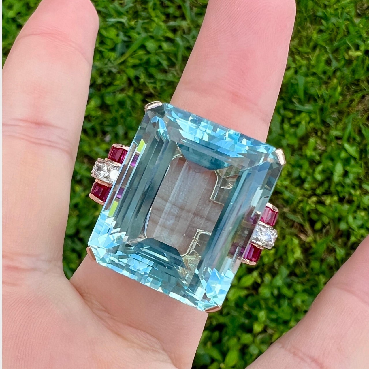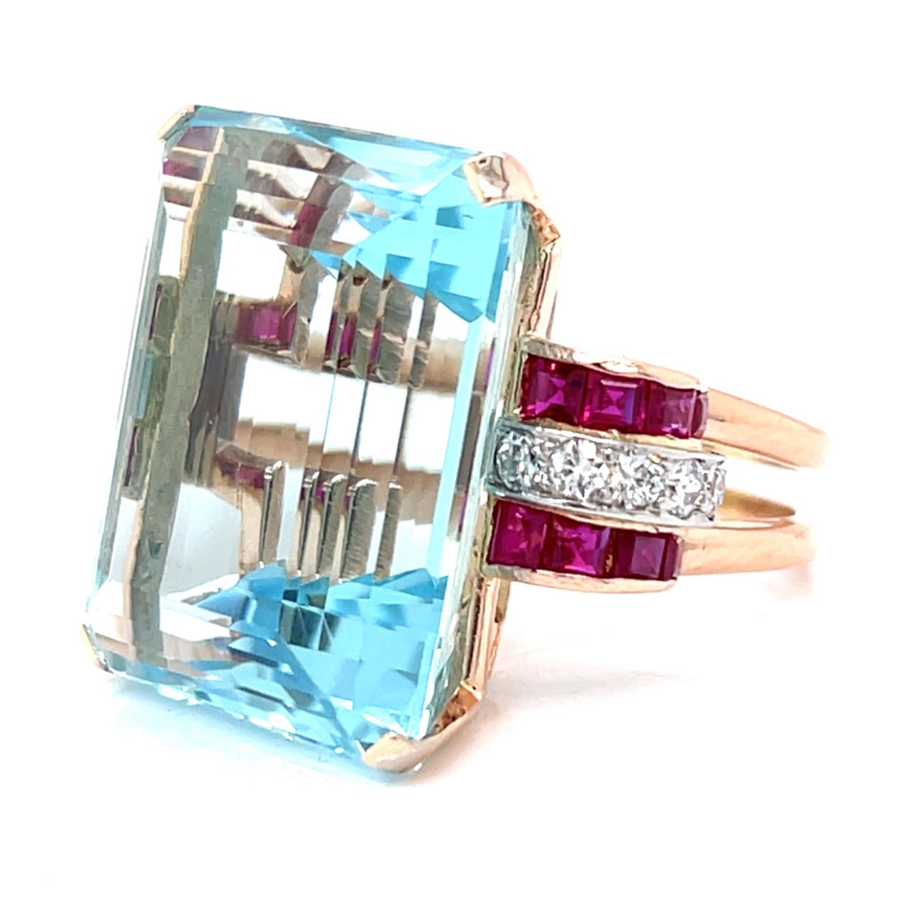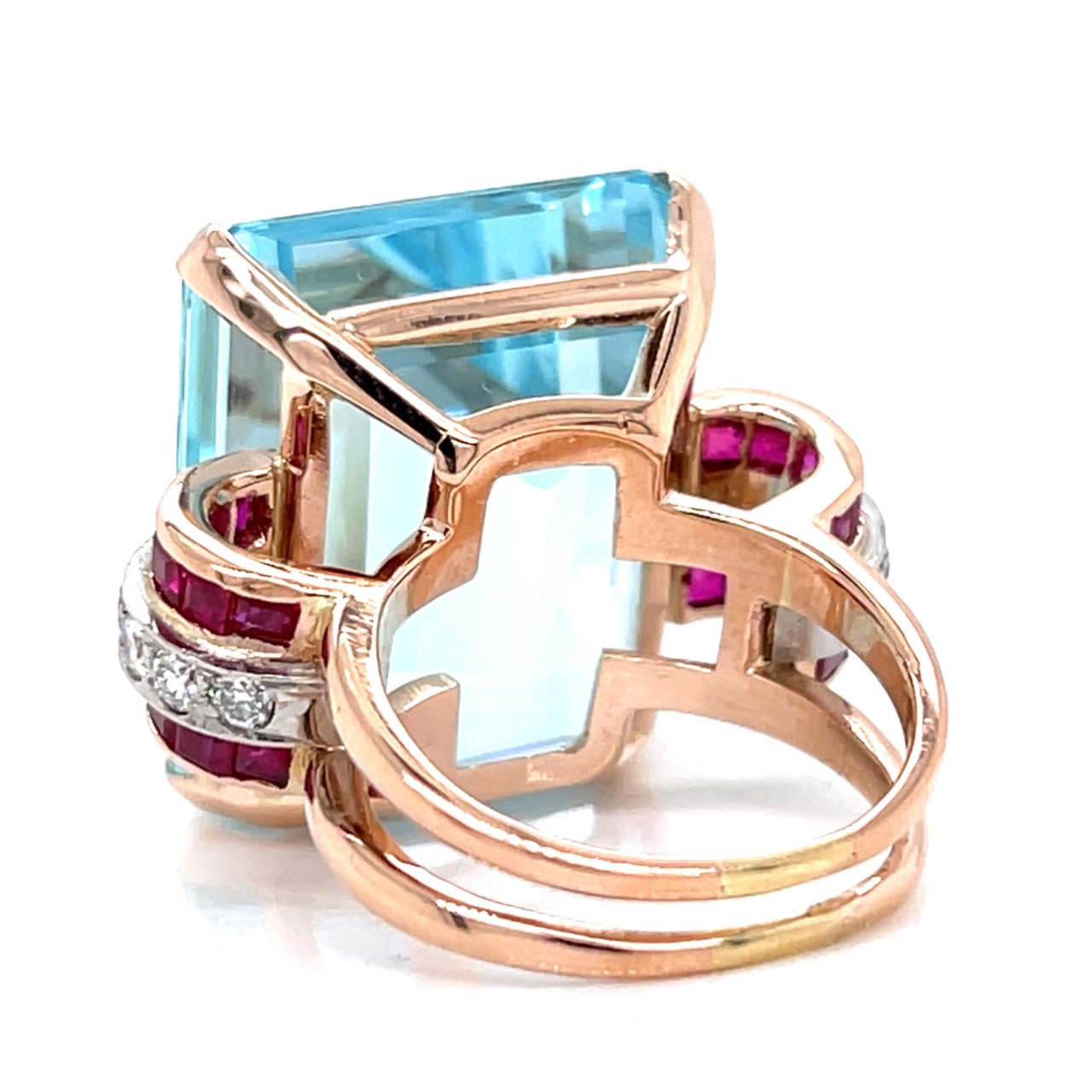 Retro 14K Rose Gold 50.00 Ct. Aquamarine, Burma Ruby, and Diamond Ring