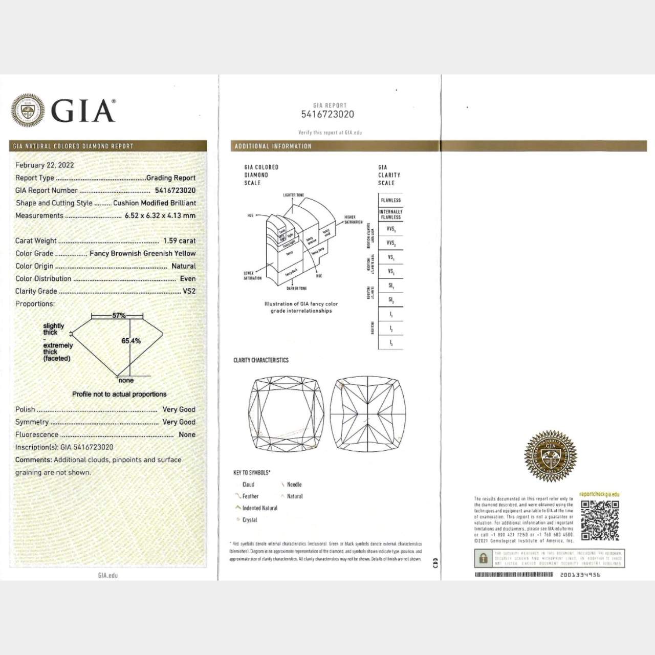 Set with a GIA Certified 1.59 Ct. Cushion-cut Diamond in Center Natural Fancy Brownish Greenish Yellow Color, VS2 Clarity GIA #5416723020 6.52 x 6.32 x 4.13mm