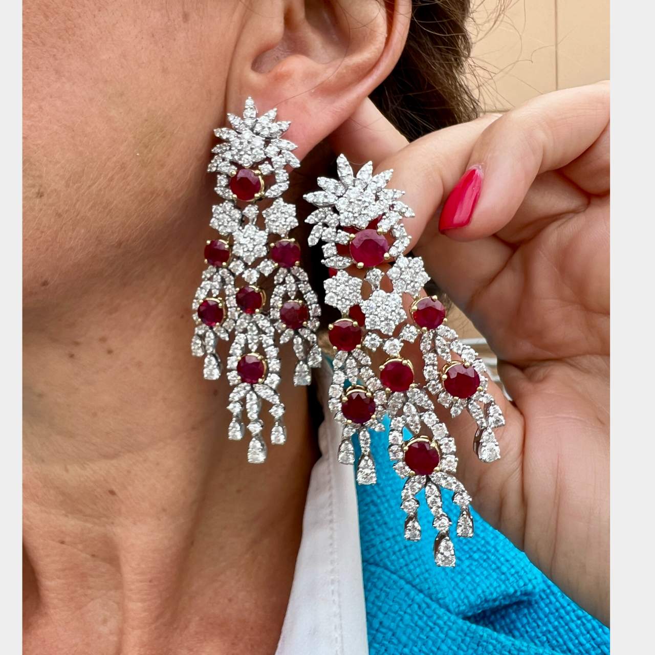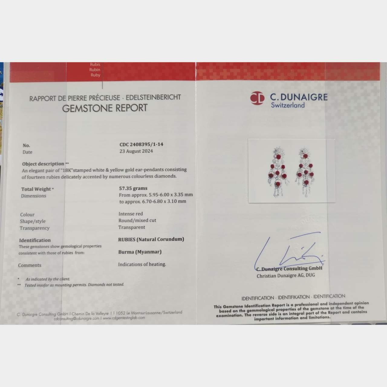 18K White Gold C. DUNAIGRE Certified Burma Ruby & Diamond EarringsWeighing 57.4 grams