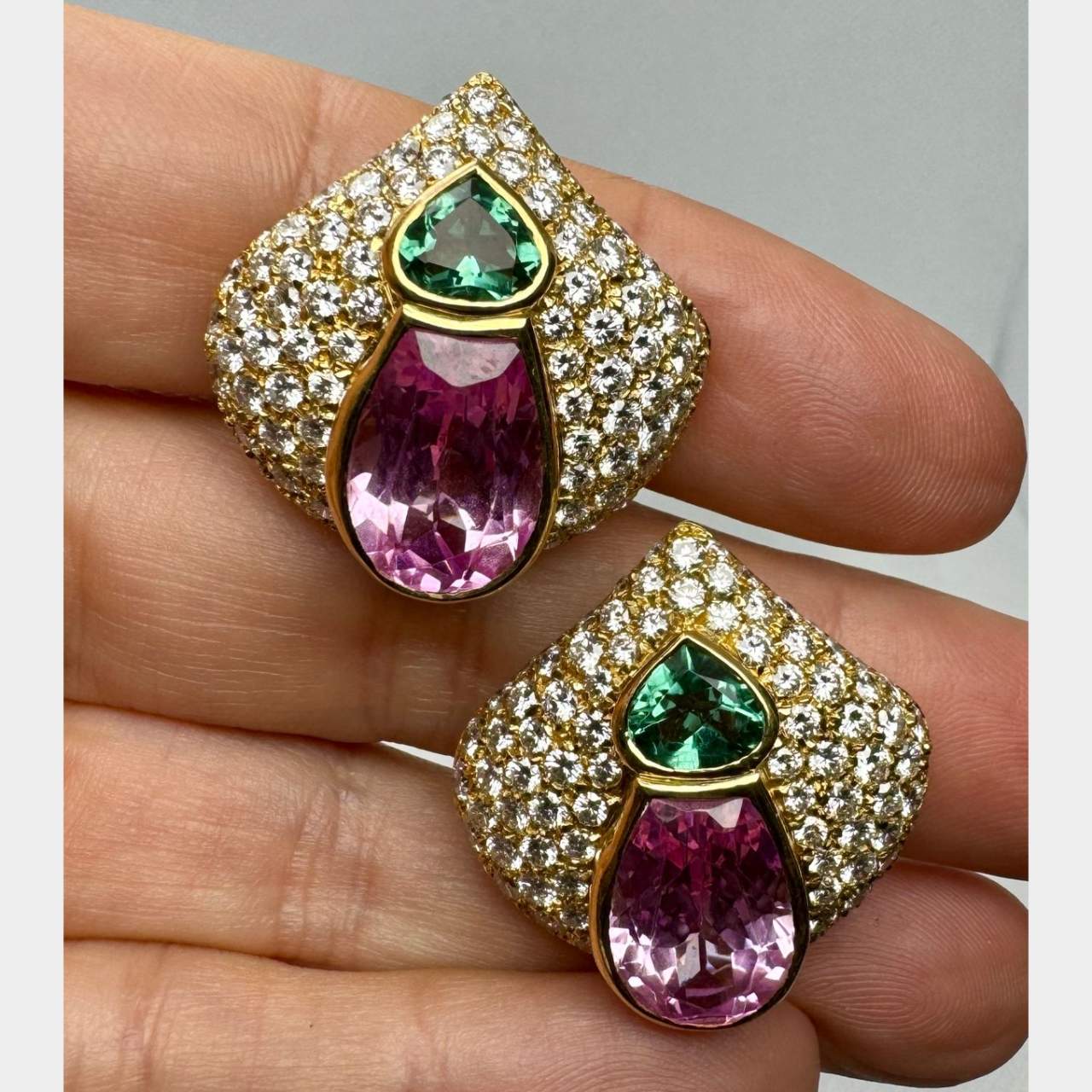 18K Yellow Gold Peridot, Kunzite, & Diamond EarringsWeighing 29.1 grams
