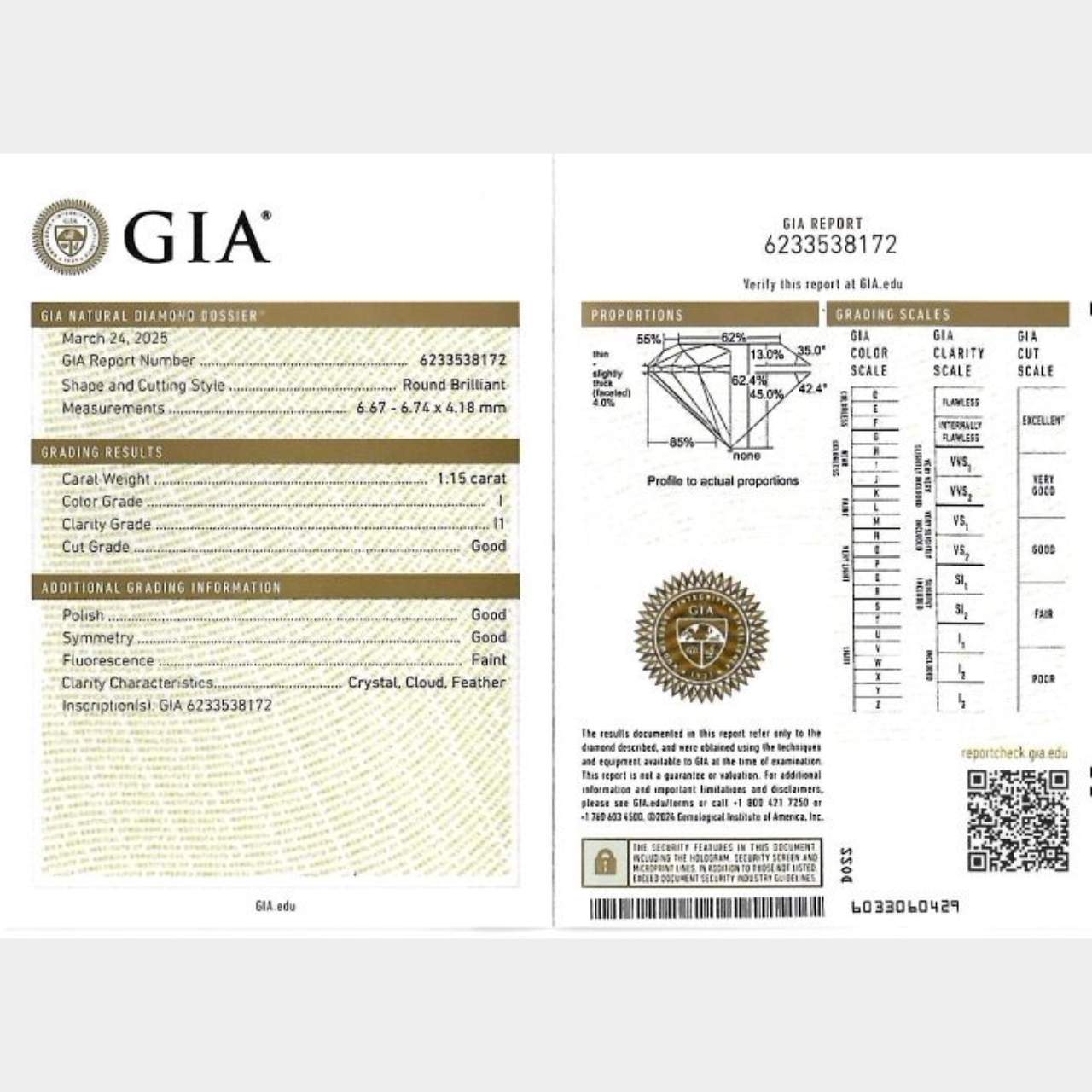 Along with a 1.11 Ct. Diamond (No Cert)I Color, I1 Clarity