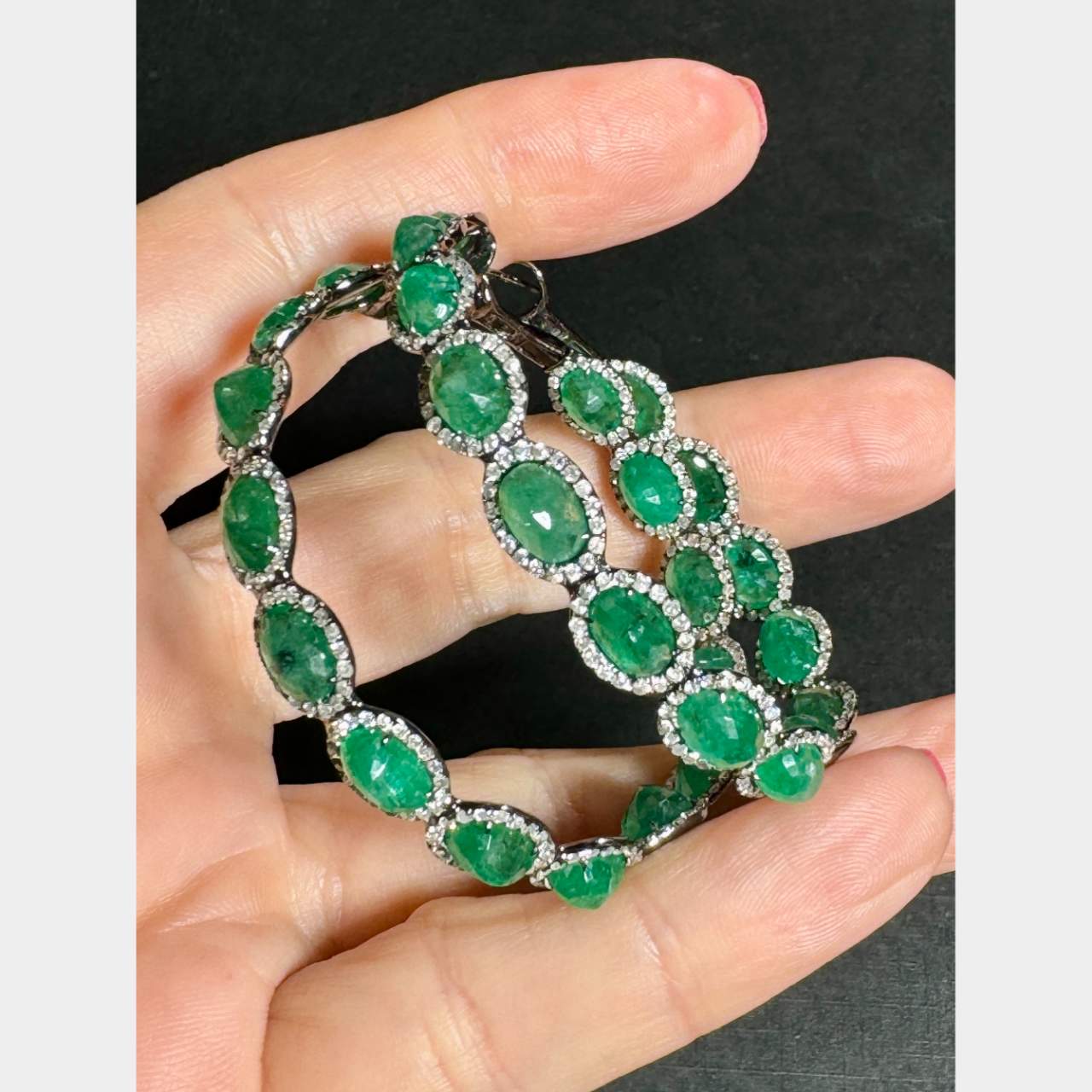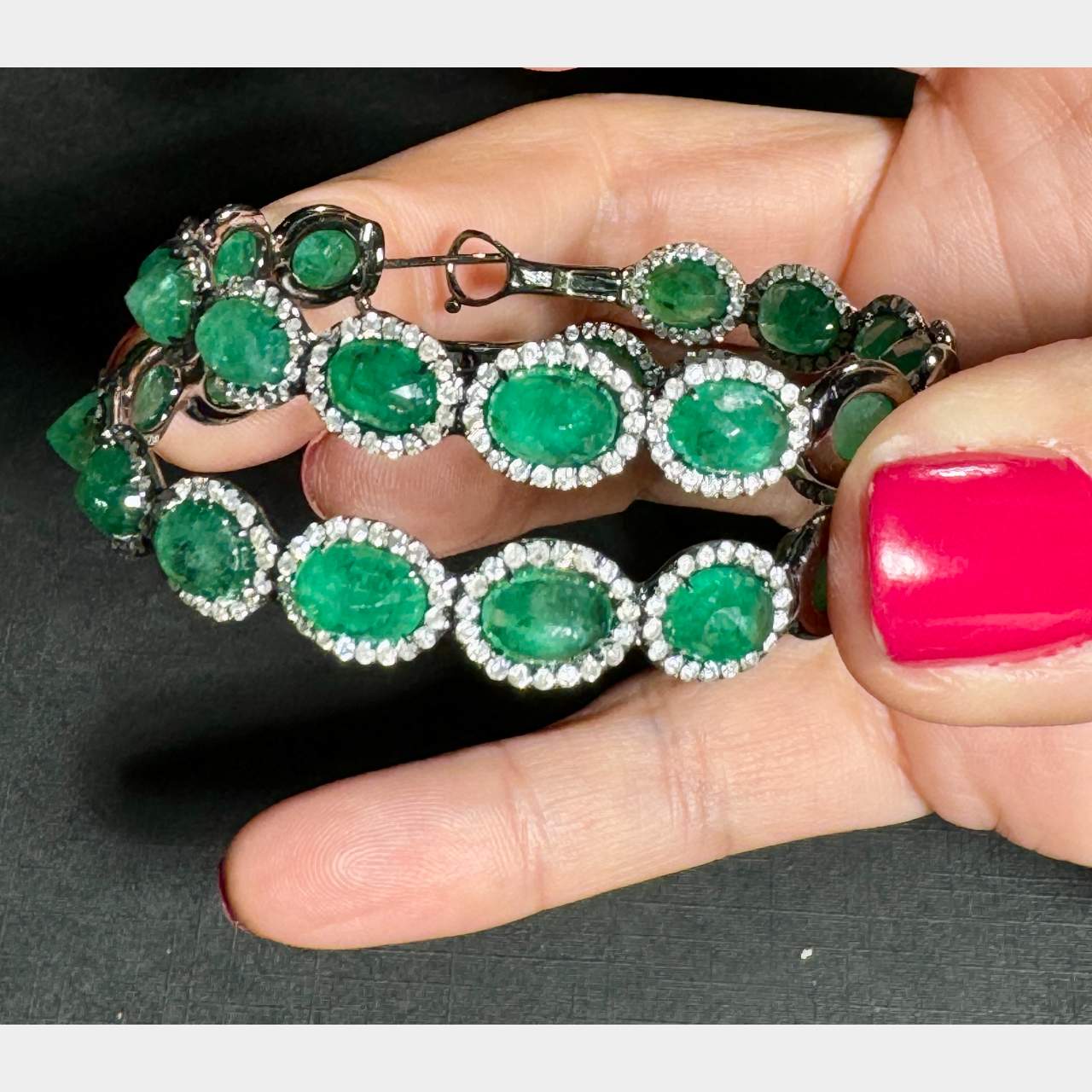 18K White Gold Emerald & Diamond Hoop EarringsWeighing 21.2 grams
