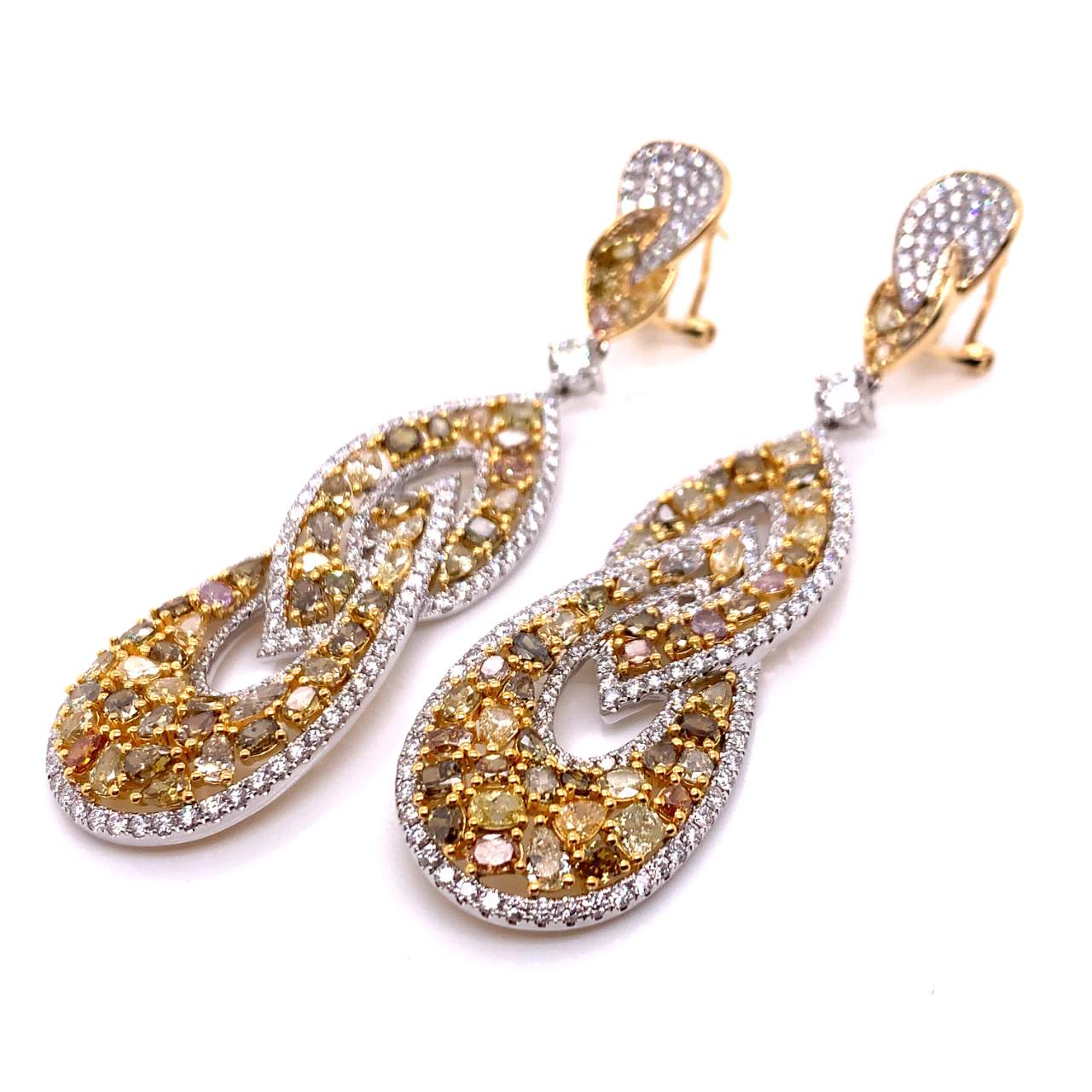 18K White and Yellow Gold Fancy Yellow Diamond EarringsWeighing 31.8 gramsSet with app. 10.00 Ct of Fancy Color diamondsAlong with 2 Diamonds weighing app. 0.69 Ct.And 3.91 Ct. of DiamondsF-G Color, VVS-SI1 Clarity3 inches in length