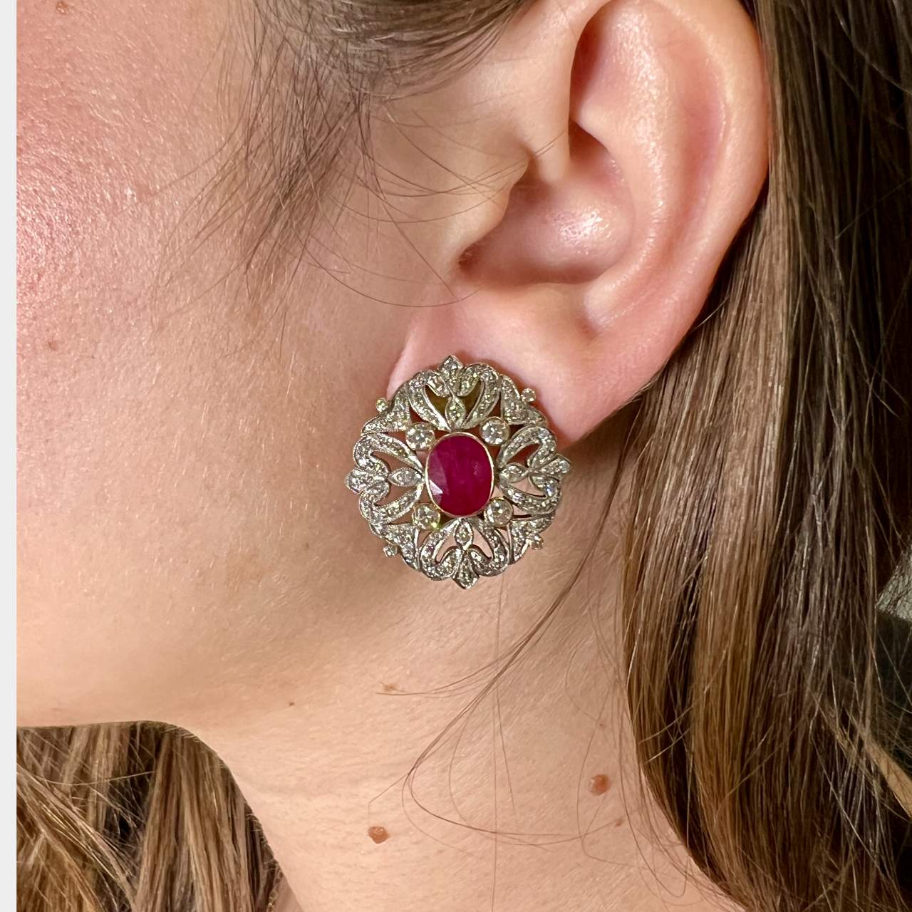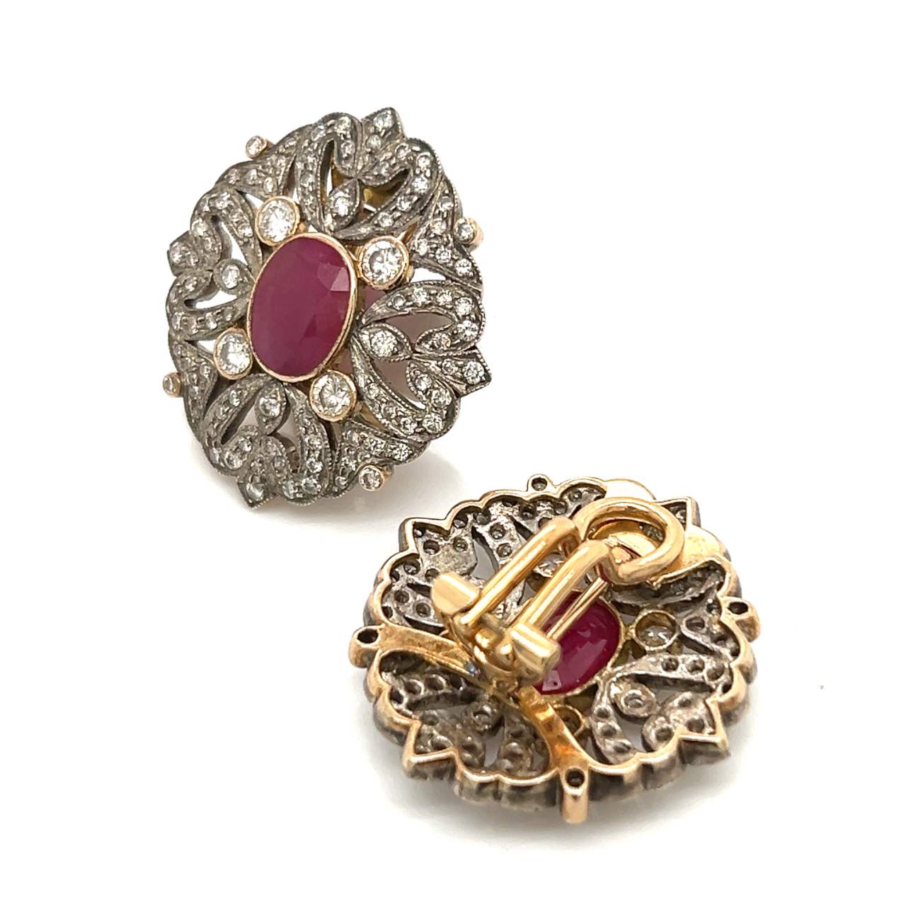 18K Yellow Gold & Silver Diamond and Ruby EarringsWeighing 15.4 gramsSet with2 Rubies weighing app. 4.00 C.Along with 184 Diamonds weighing app. 4.00 Ct.G-I Color, VS1-SI1 Clarity1 inch in length
