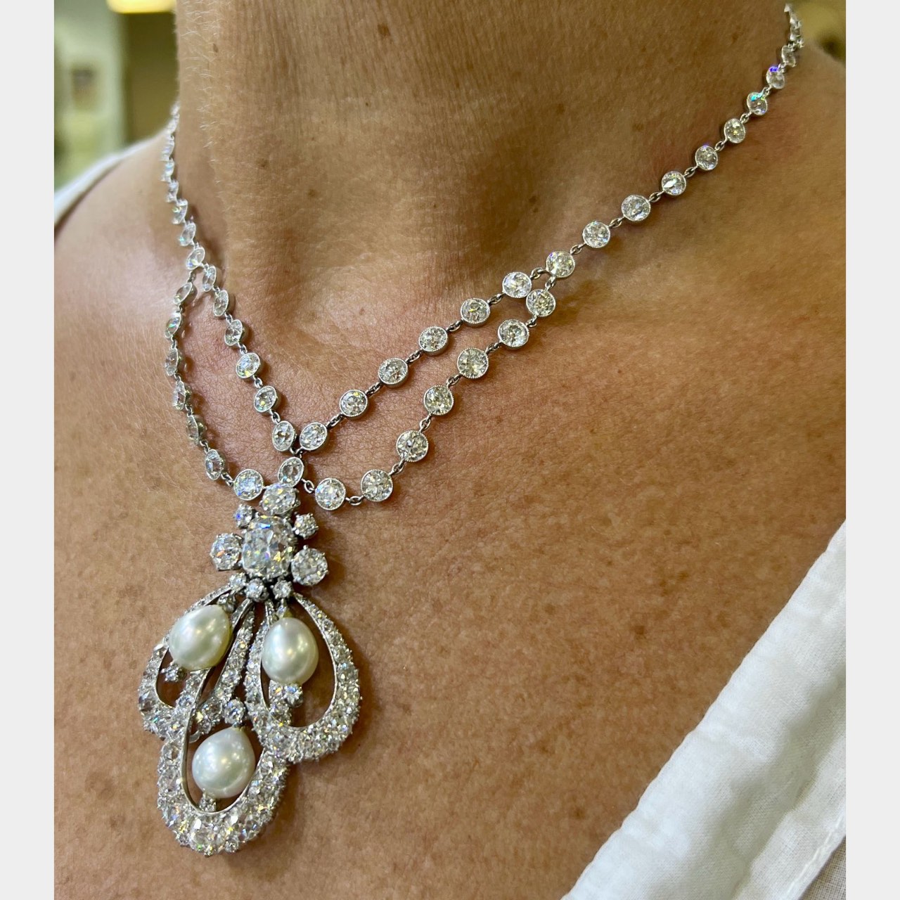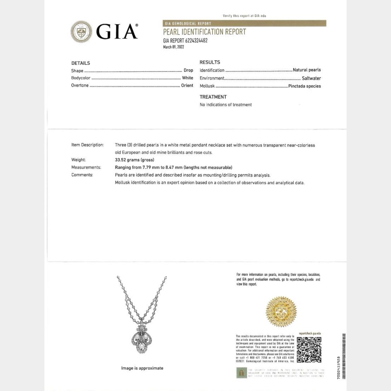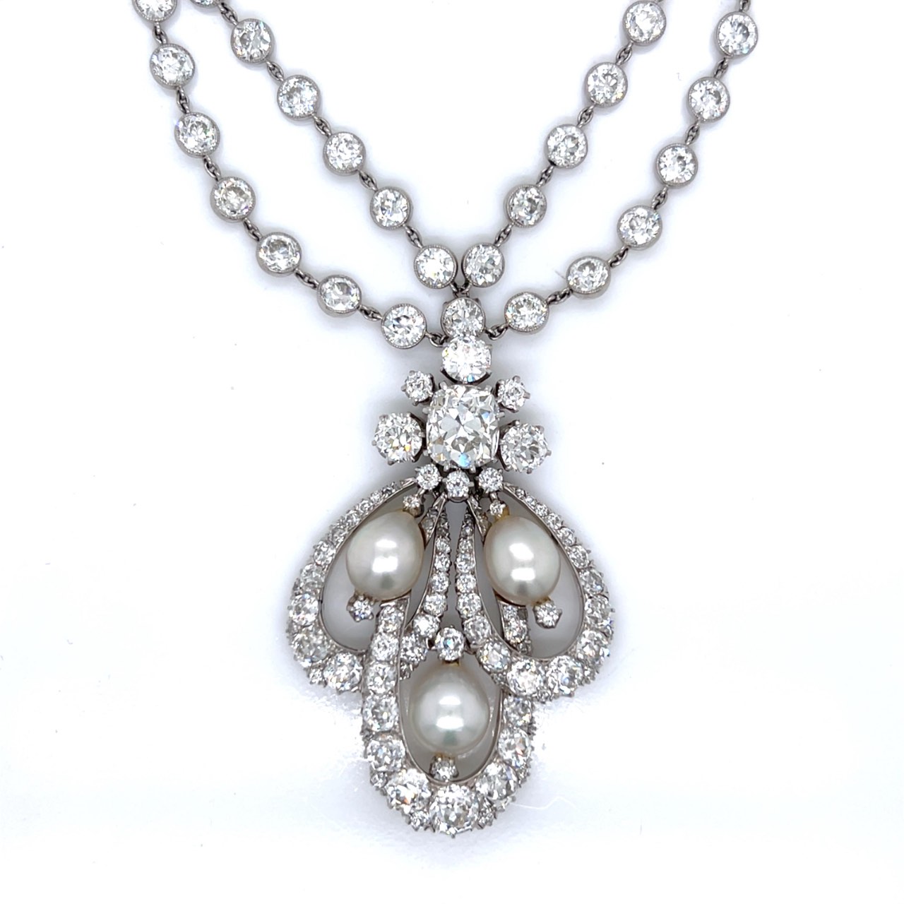 Art Deco Platinum GIA Certified Natural Pearl & Diamond NecklaceWeighing 33.6 grams
