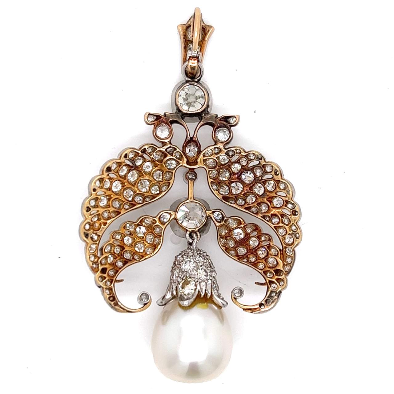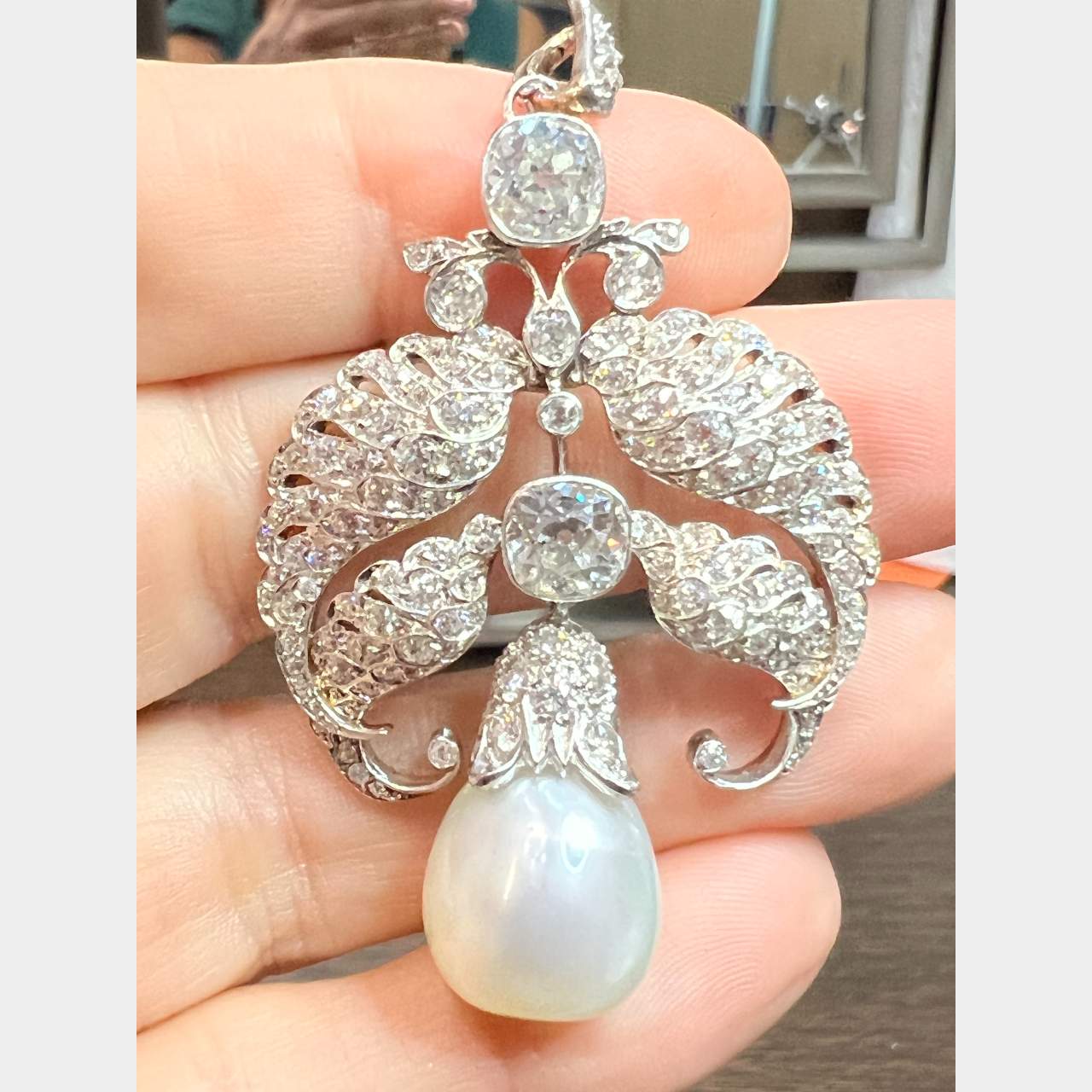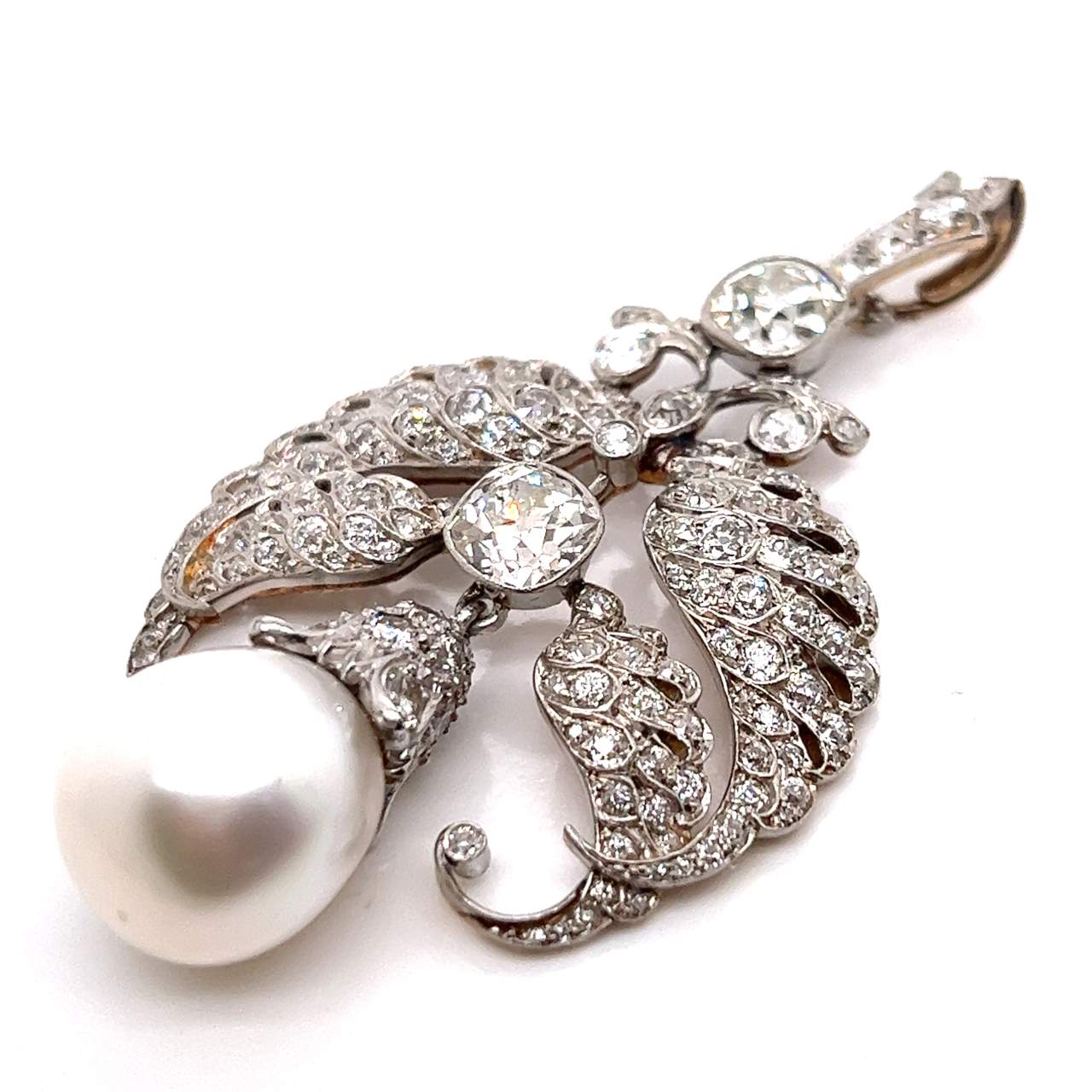 Antique 18K & Platinum Diamond and Pearl PendantWeighing 18.4 gramsSet with: 2 Diamonds weighing app. 3.50 Ct.J-K Color, VS1-SI2 Clarity151 Diamonds weighing app 7.50 Ct.F-H Color, VS1-SI1 Clarity2.5 inches in length