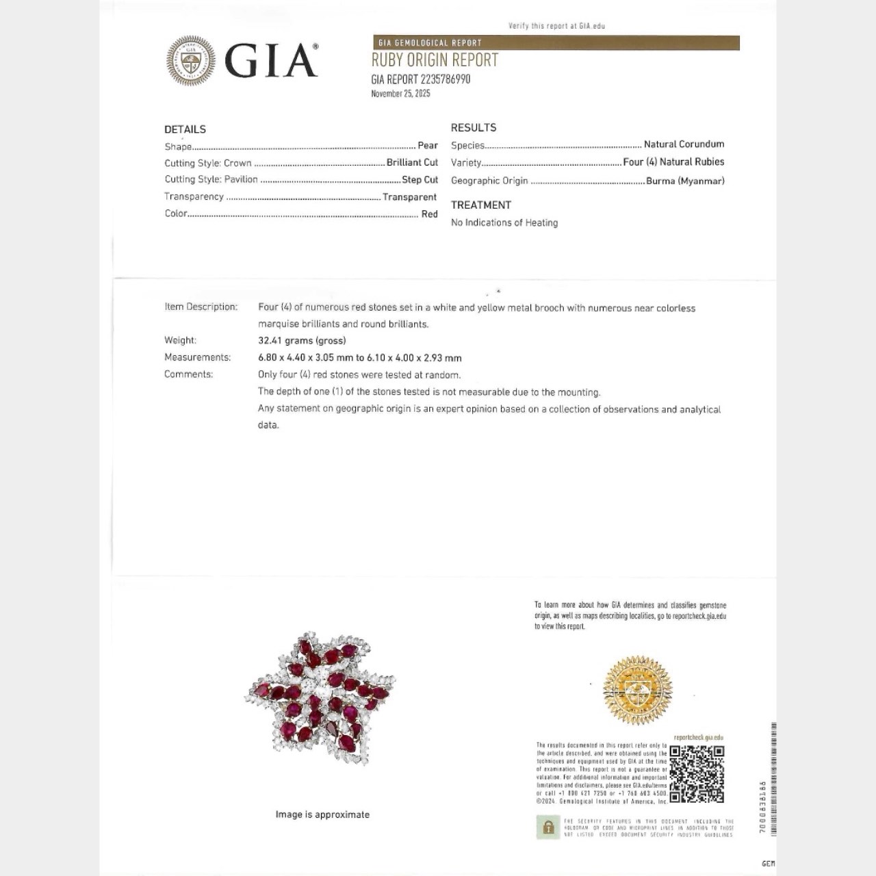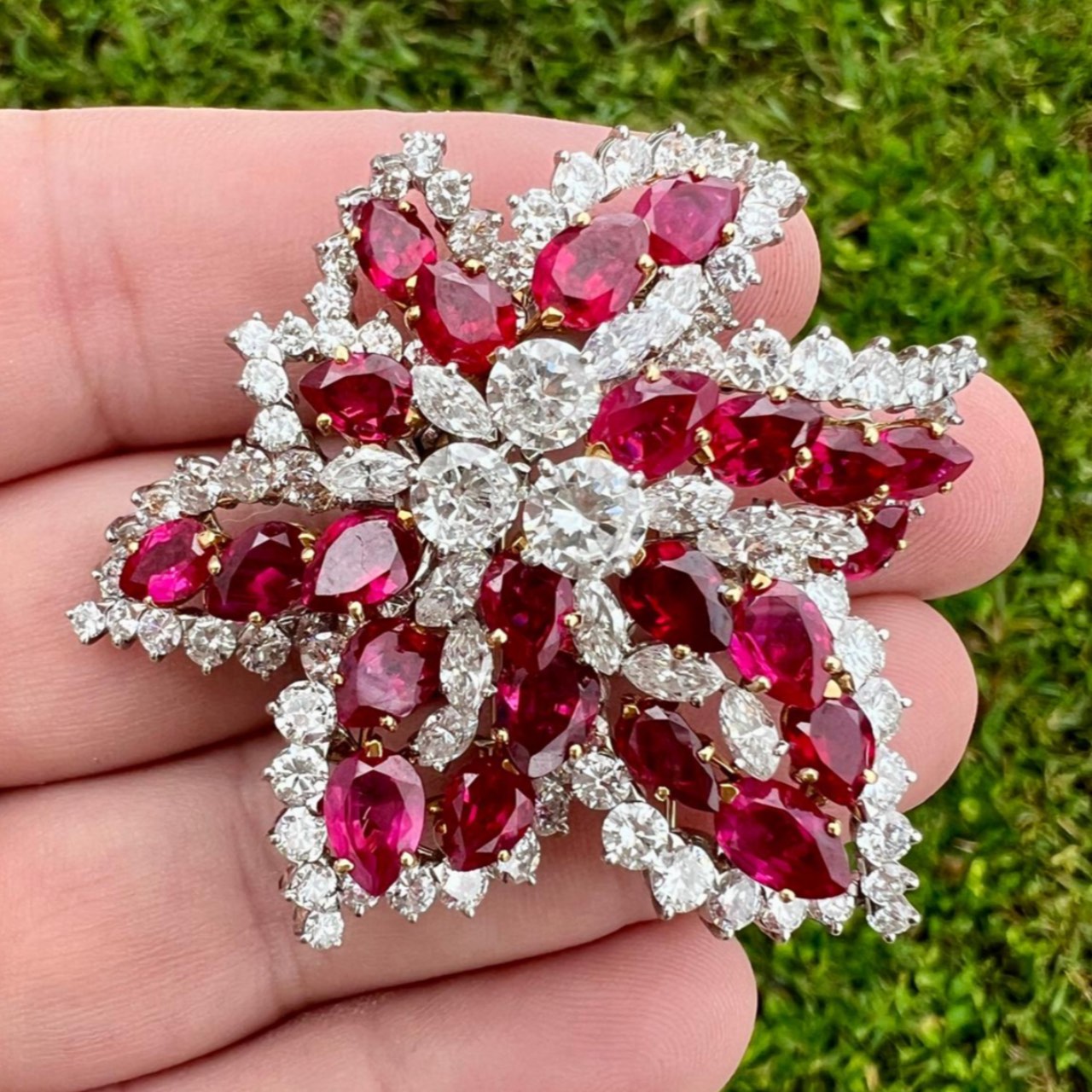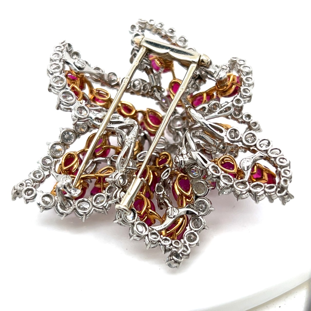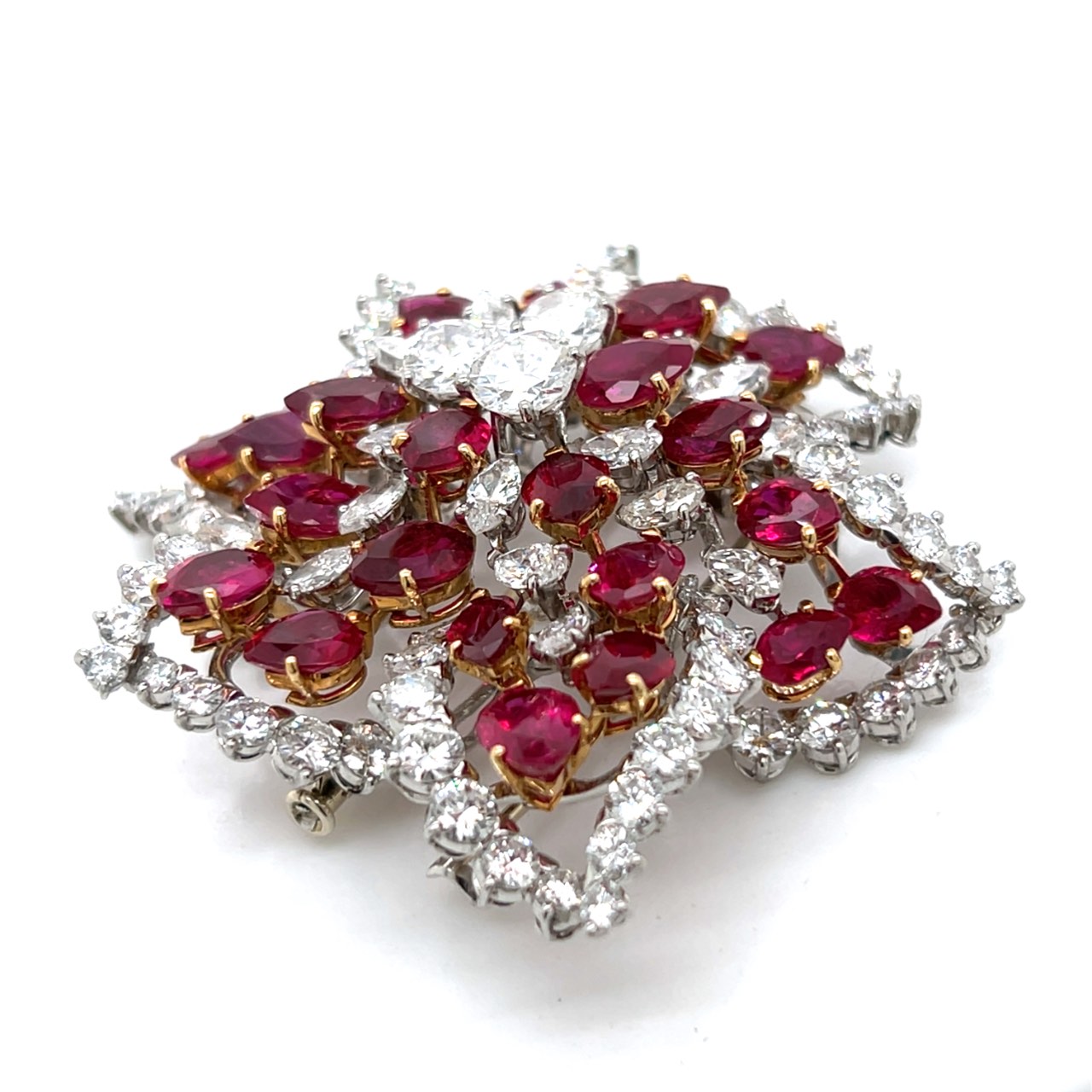 Platinum & 18K Yellow Gold GIA Certified Burma No-heat Ruby and Diamond BroochWeighing 32.4 grams