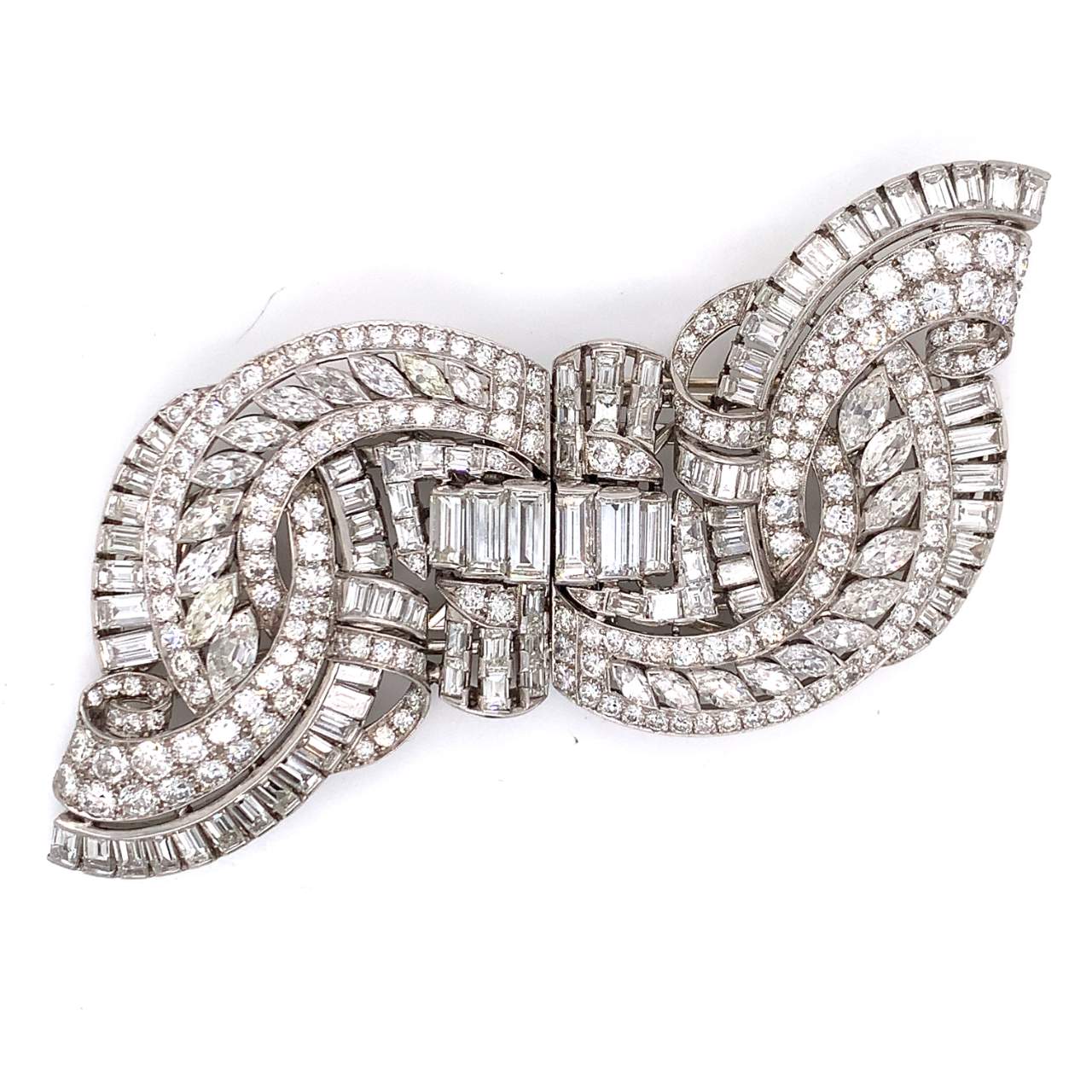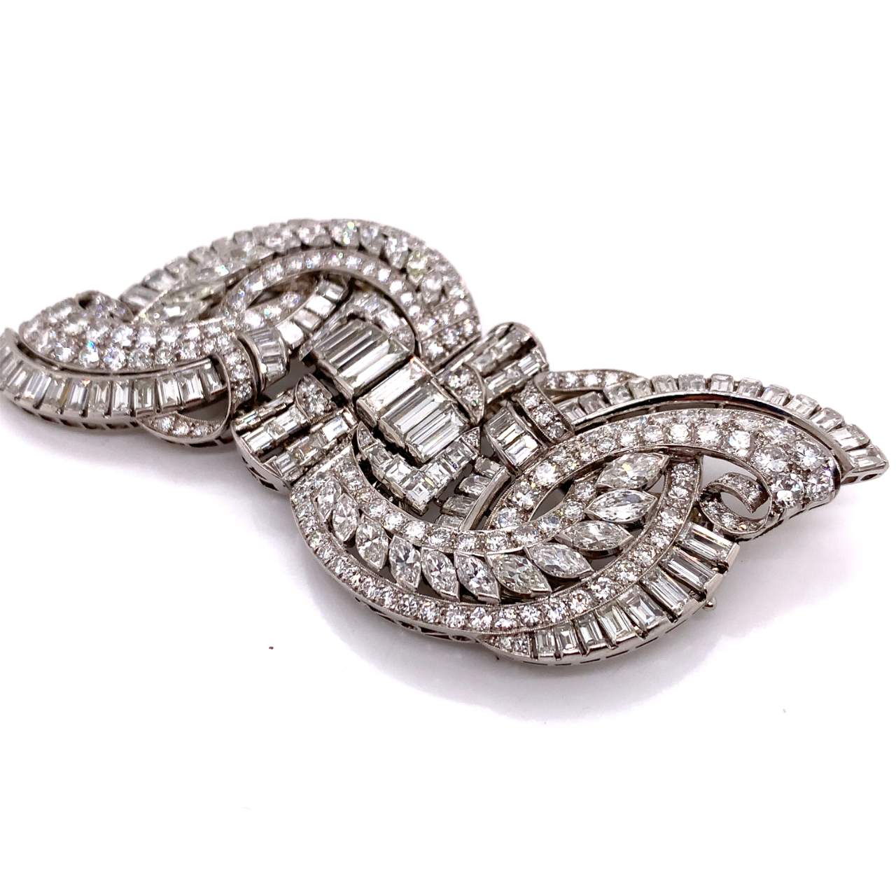 Art Deco Platinum Clips/BroochWeighing 55.7 gramsSet with app. 27.50 Ct. of DiamondsE-G Color, VVS-VS Clarity3 inches x 1.5 inches