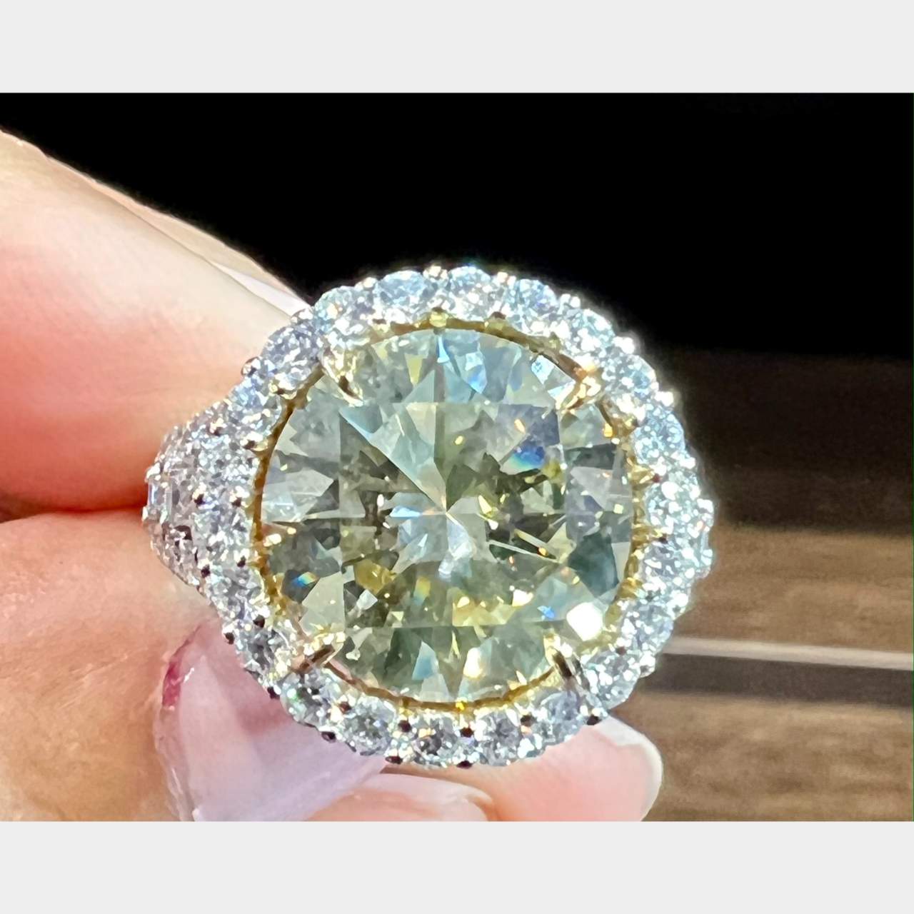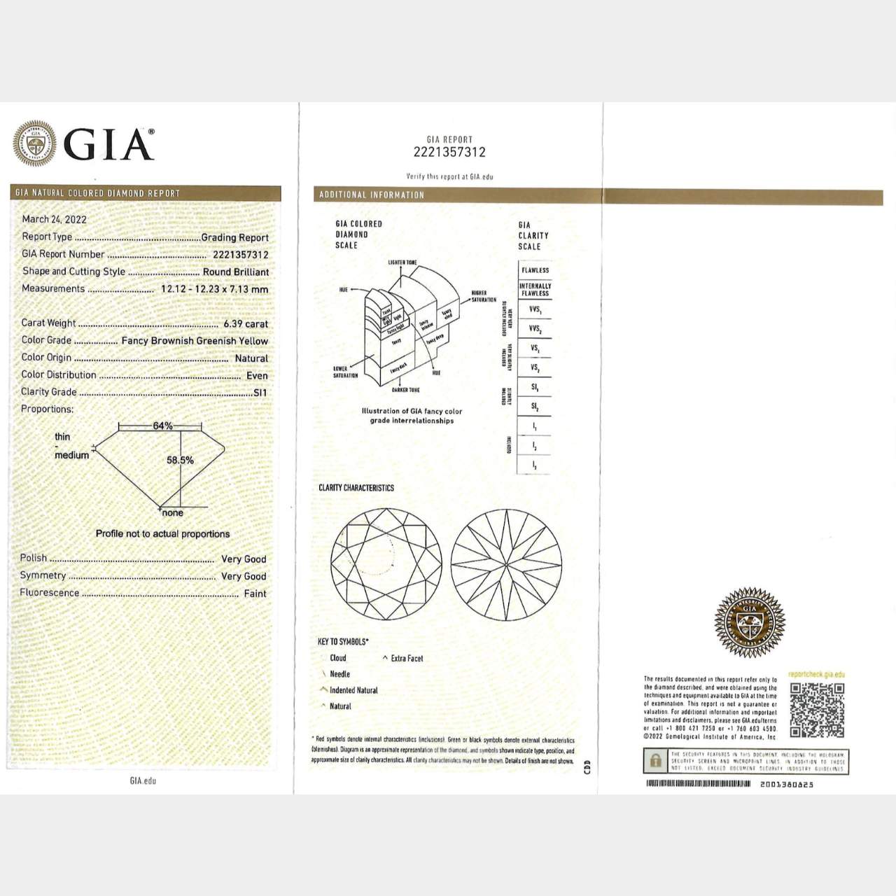 18K White and Yellow Gold GIA 6.39 Ct. Fancy Diamond Ring Weighing 8.8 grams Set with a GIA Certified 6.39 Ct. Round Brilliant Diamond Certificate # 2221357312 Fancy Brownish Greenish Yellow Color, SI1 Clarity 12.12 – 12.23 x 7.13mm GIA #2221357312 Along with app. 2.25 Ct. of Diamonds set in Mounting E-G Color, VS1-SI1 Clarity Ring Size 5