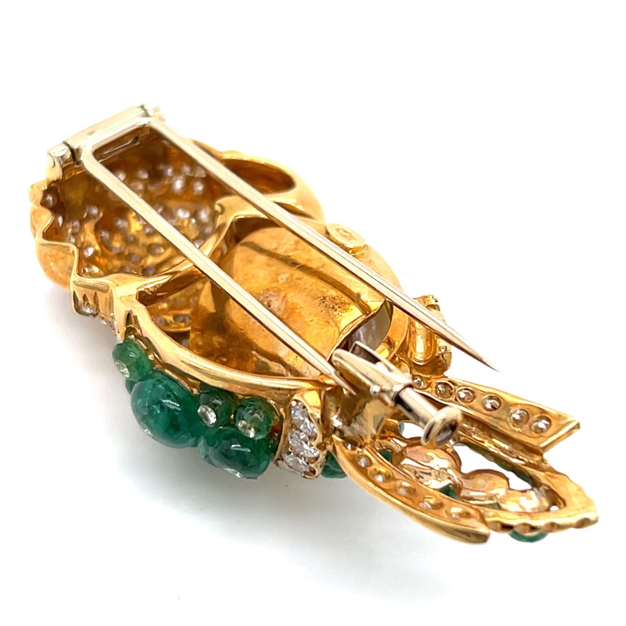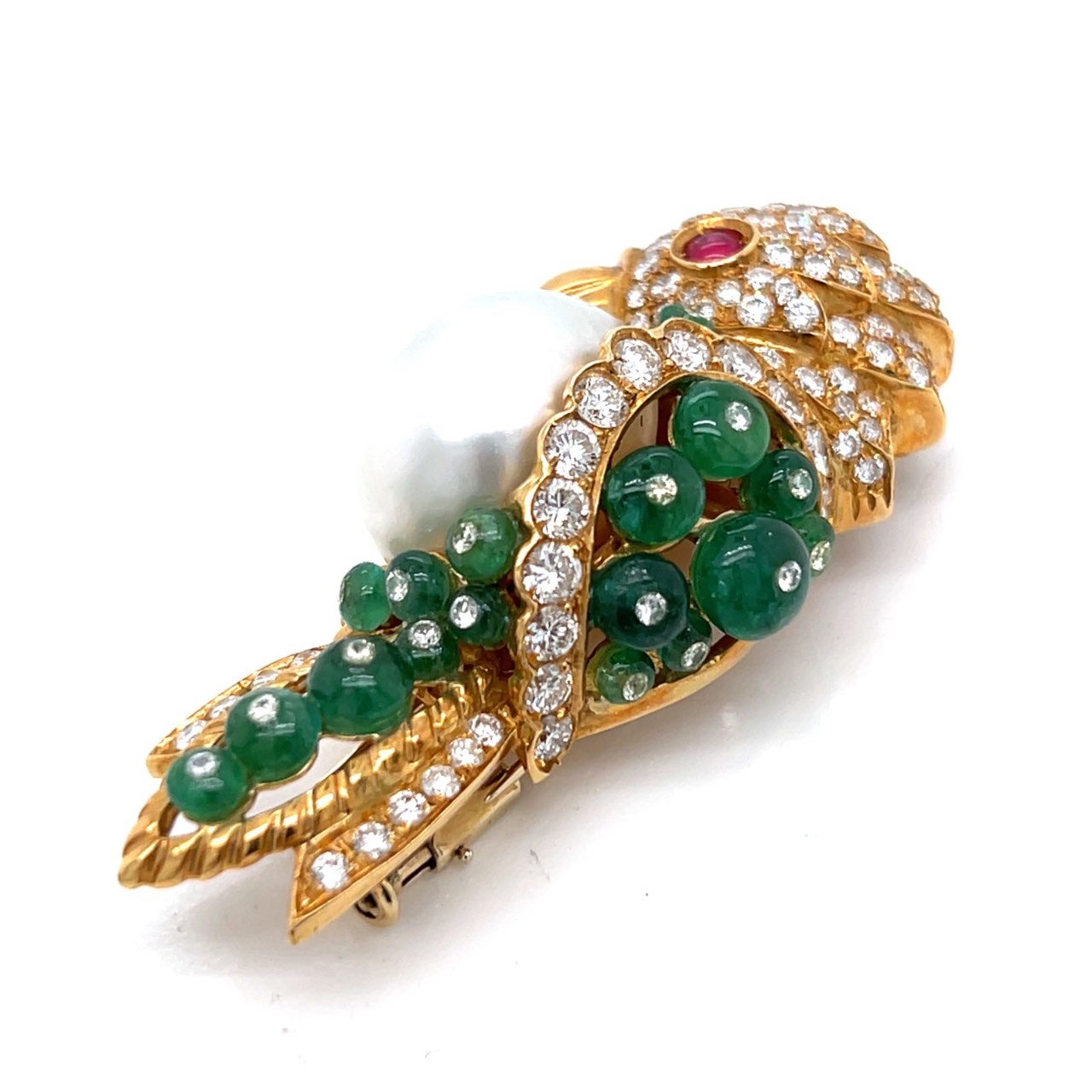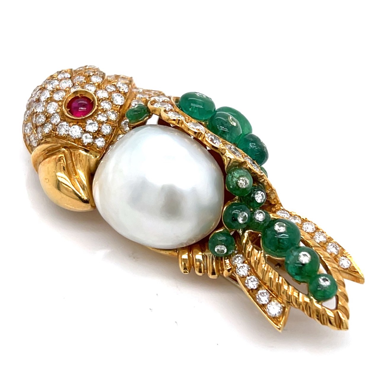 18K Yellow Gold South Sea Pearl, Diamond, Emerald, and Ruby Parrot BroochWeighing 29.7 grams