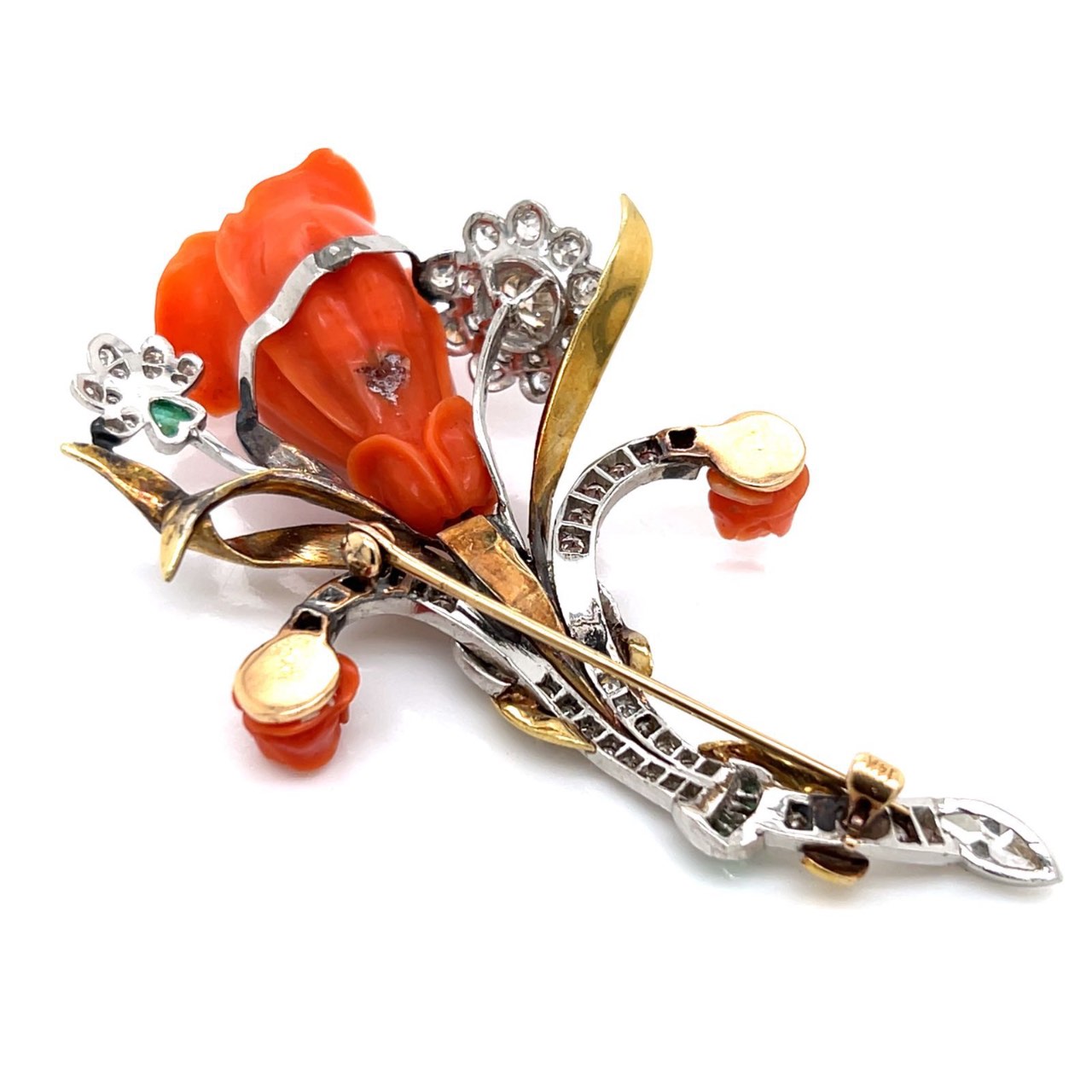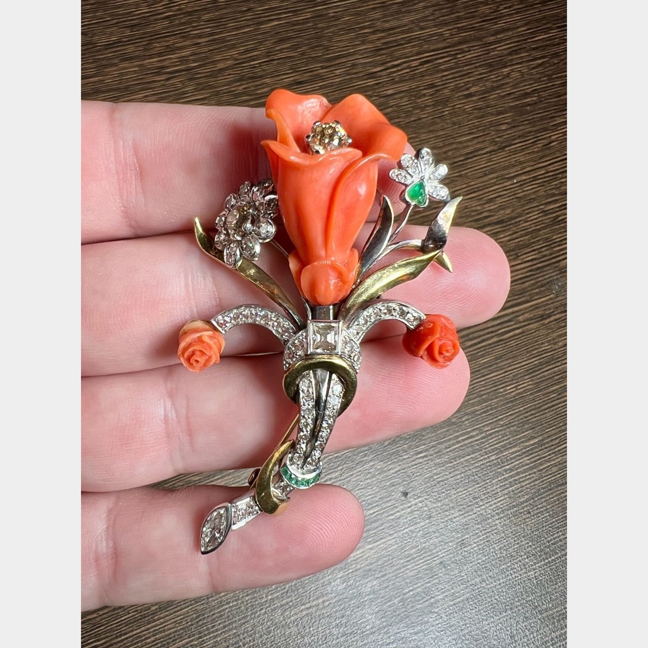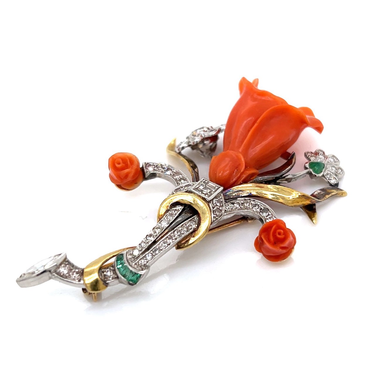 Art Deco Platinum & 18K Yellow Gold Diamond, Coral, and Emerald Flower Brooch