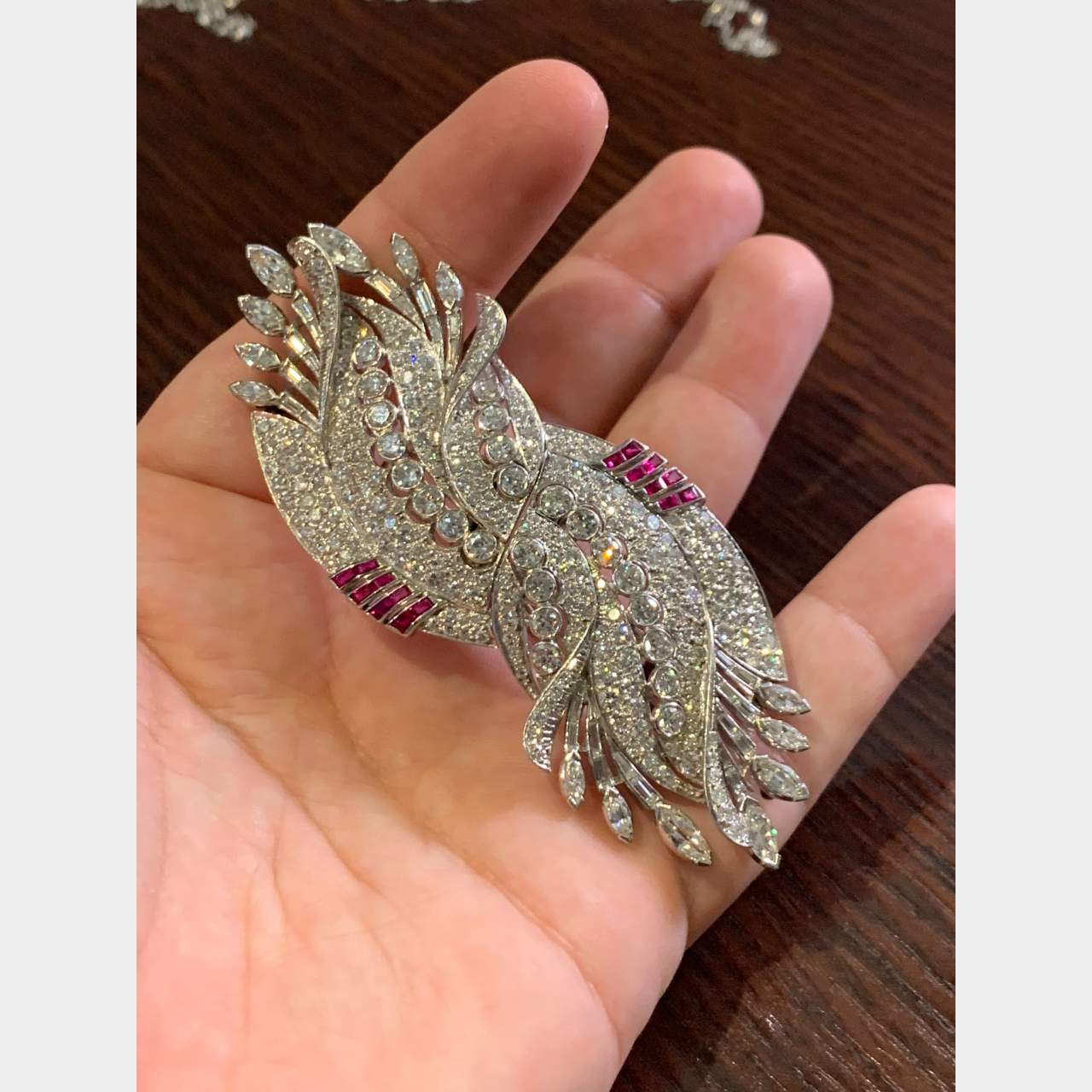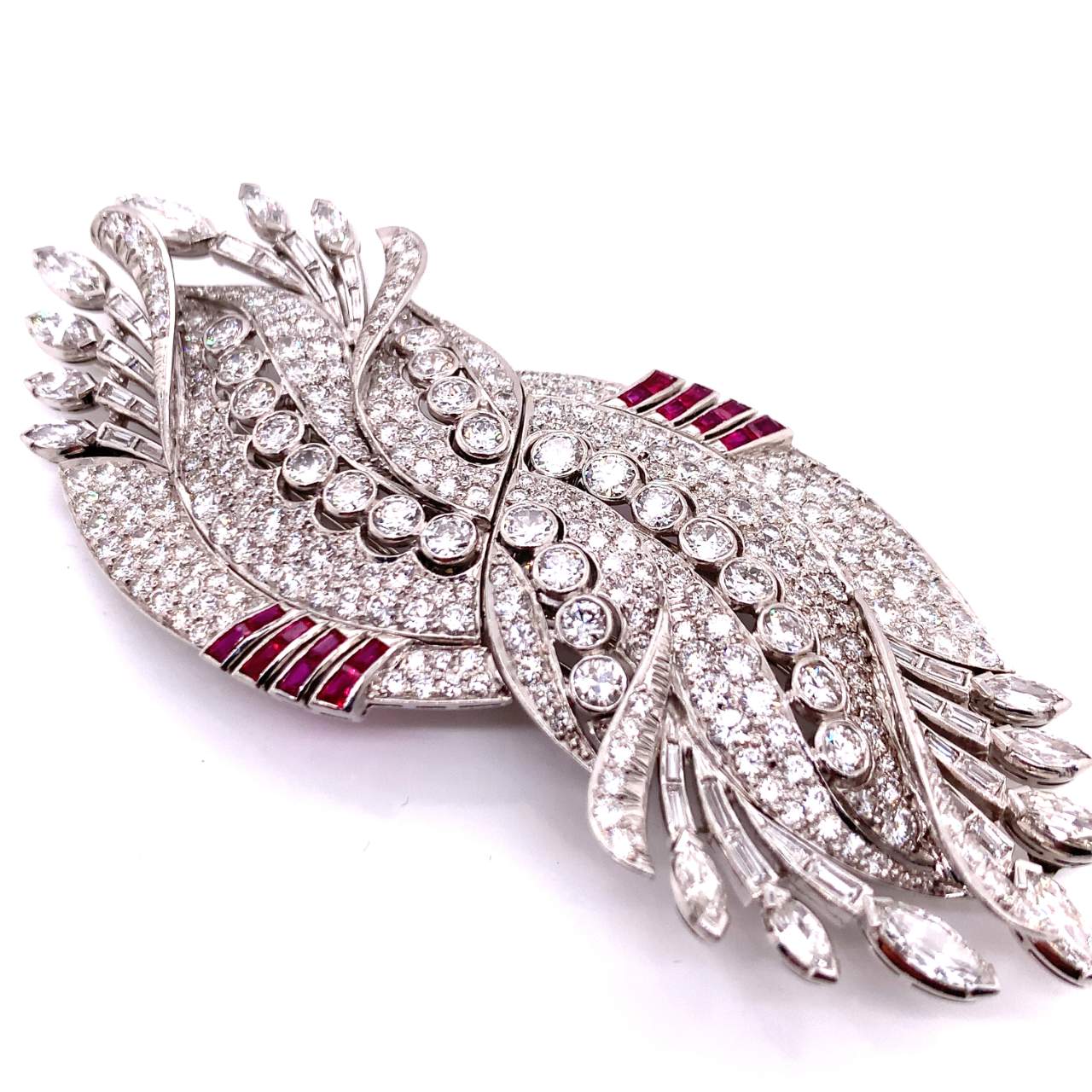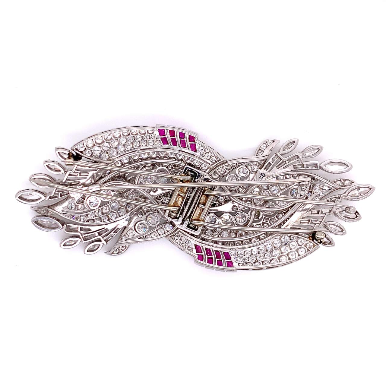 Art Deco 20.00 Ct. Diamond and Ruby BroochMounted with 20.00 Ct.* of Diamonds D-F Color VVS-VS ClarityAlong with 16 Rubies weighing 1.00 Ct.* Platinum Metal Weight: 51.60 gm.3.75 inches in length, 1.5 inches wide*approx. weight