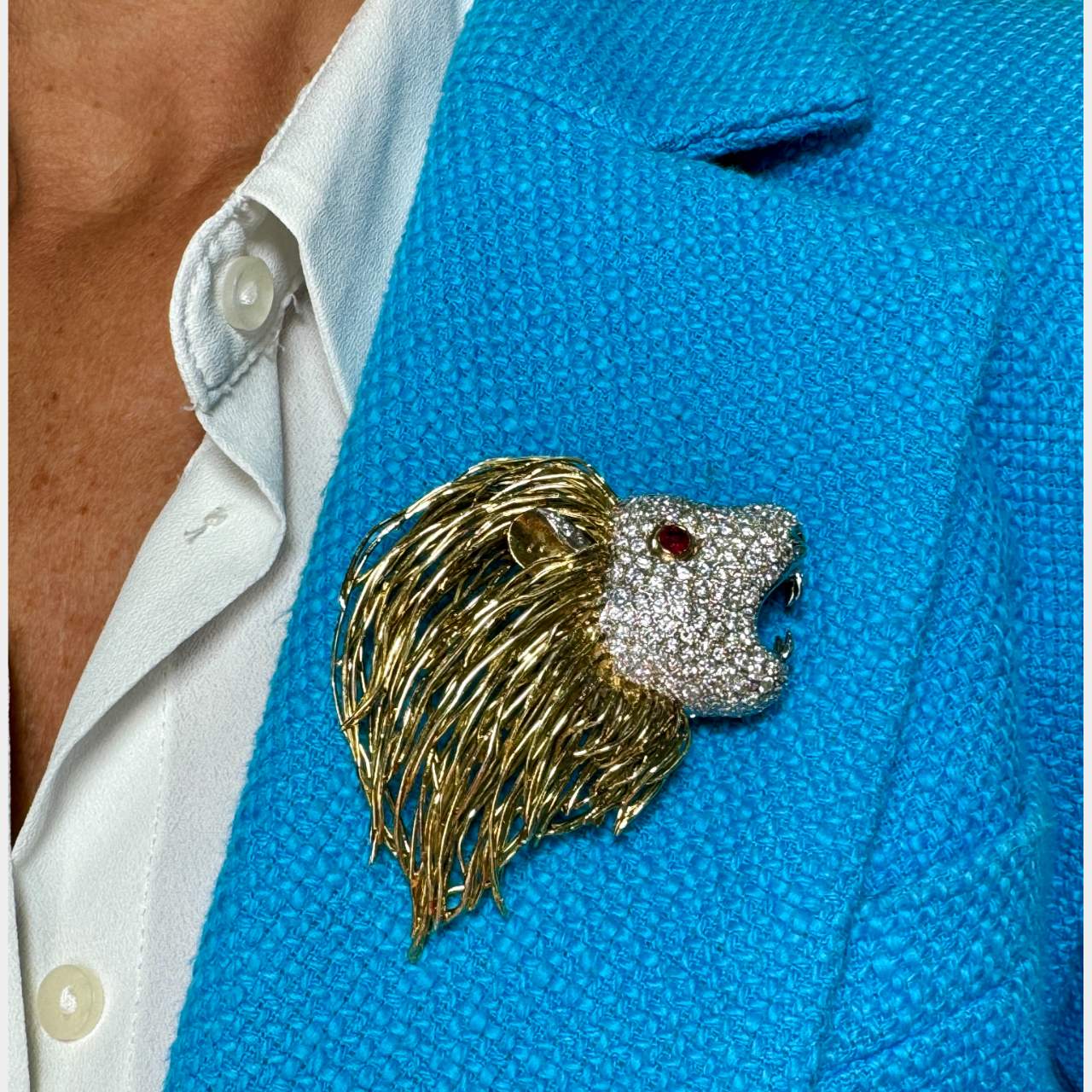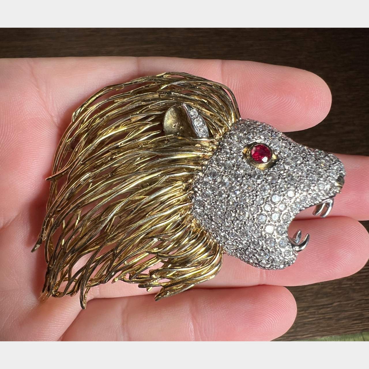 14K Yellow Gold Diamond & Ruby Lion BroochWeighing 43.9 grams