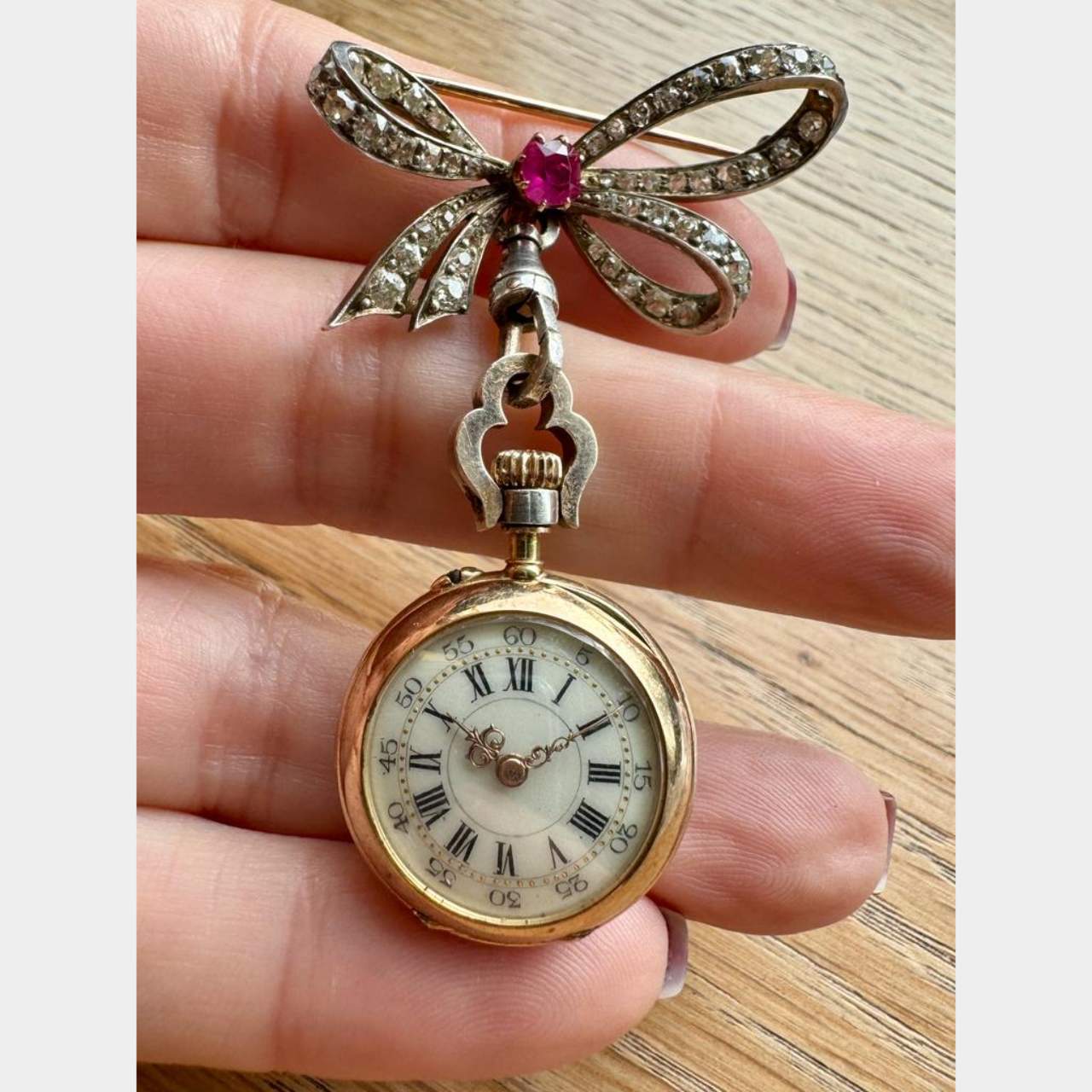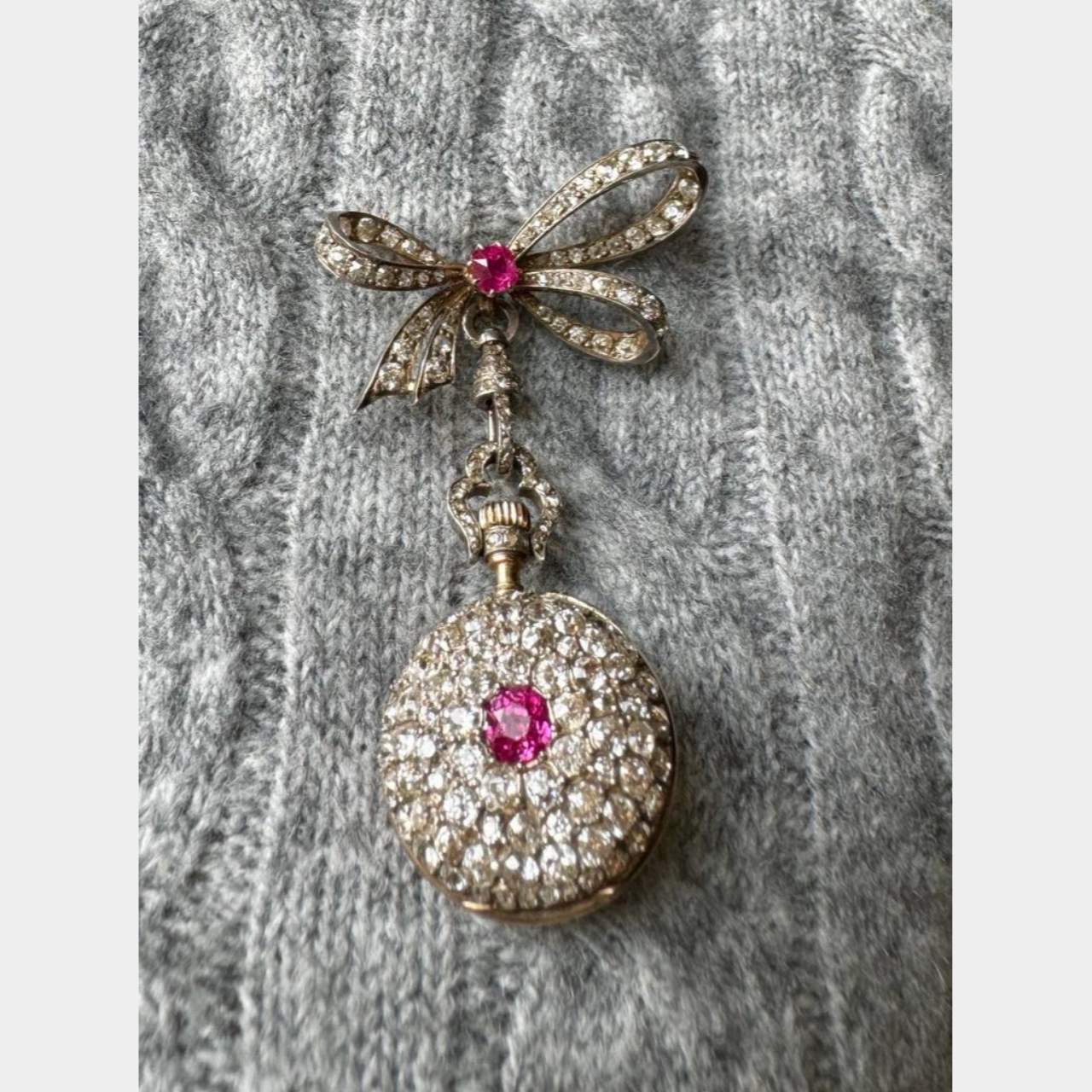 Antique PAUL DITISCHERM Platinum & 18K Diamond and Ruby Watch BroochWeighing 19.3 grams