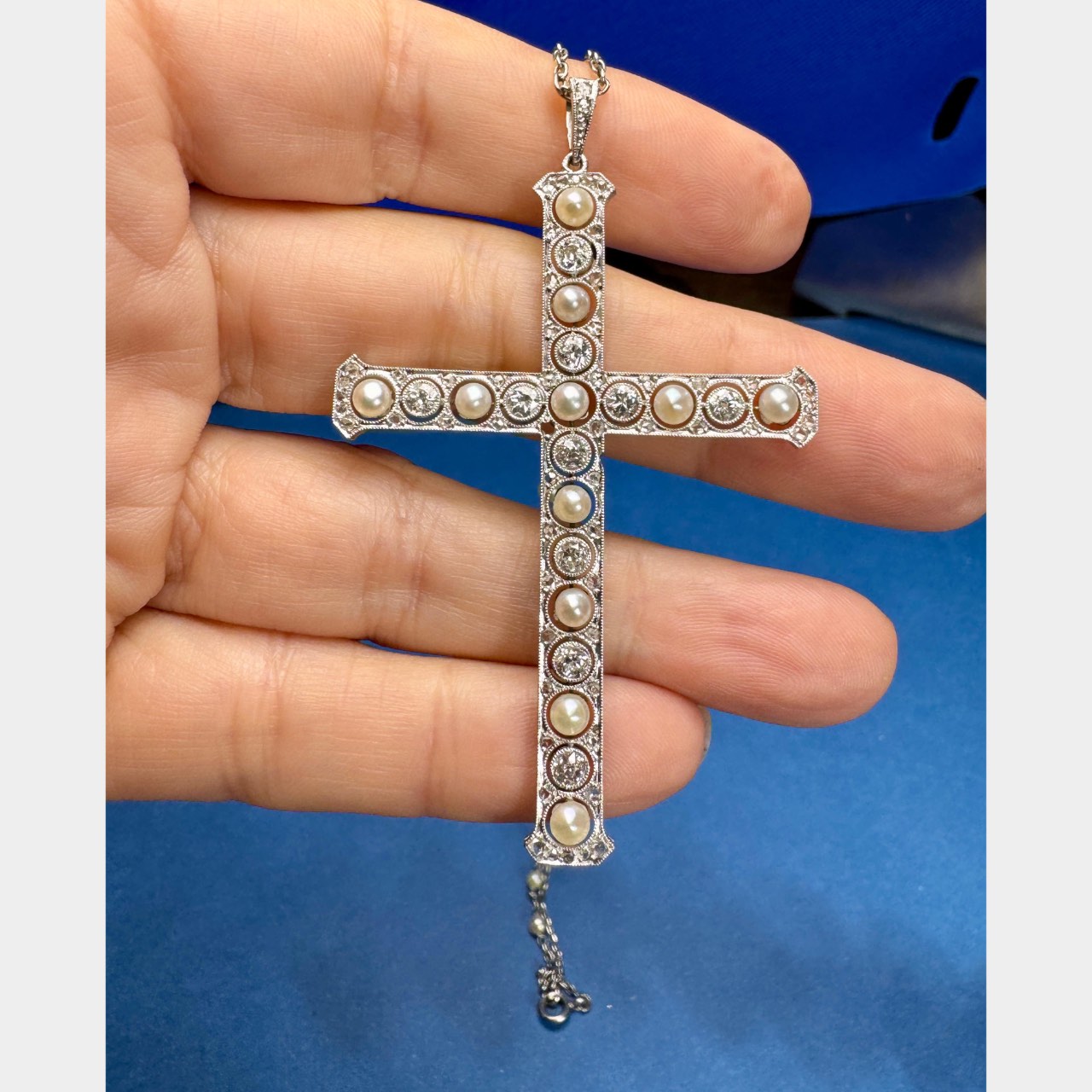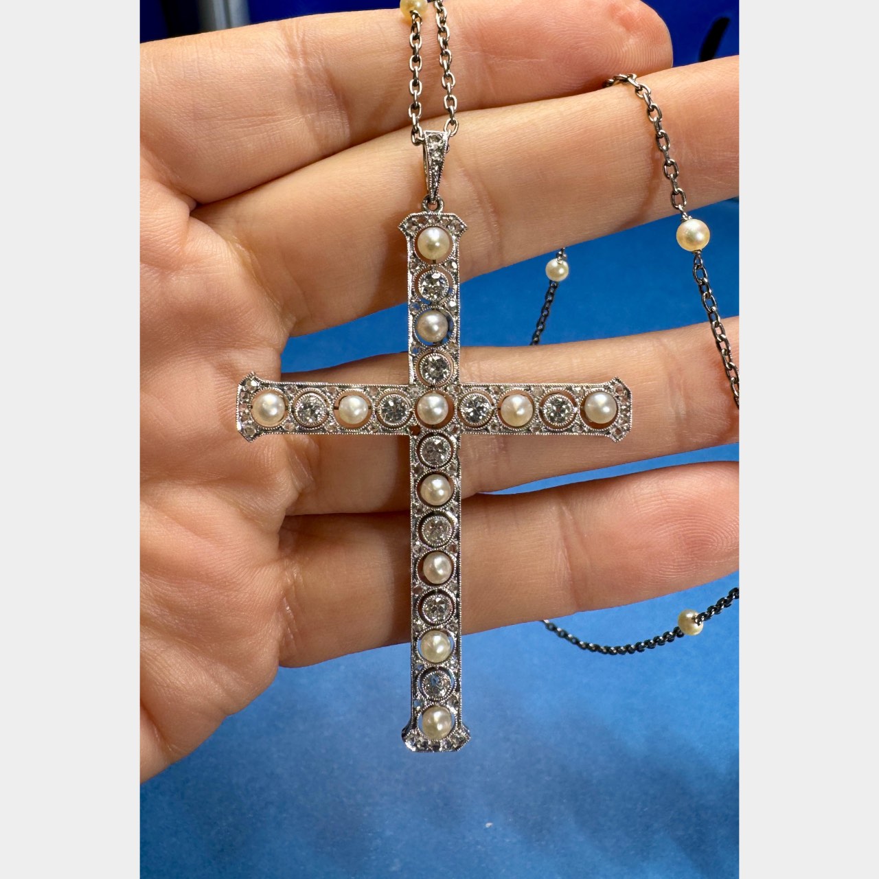 Art Deco Platinum Natural Pearl & Diamond Cross NecklaceWeighing 10.5 grams