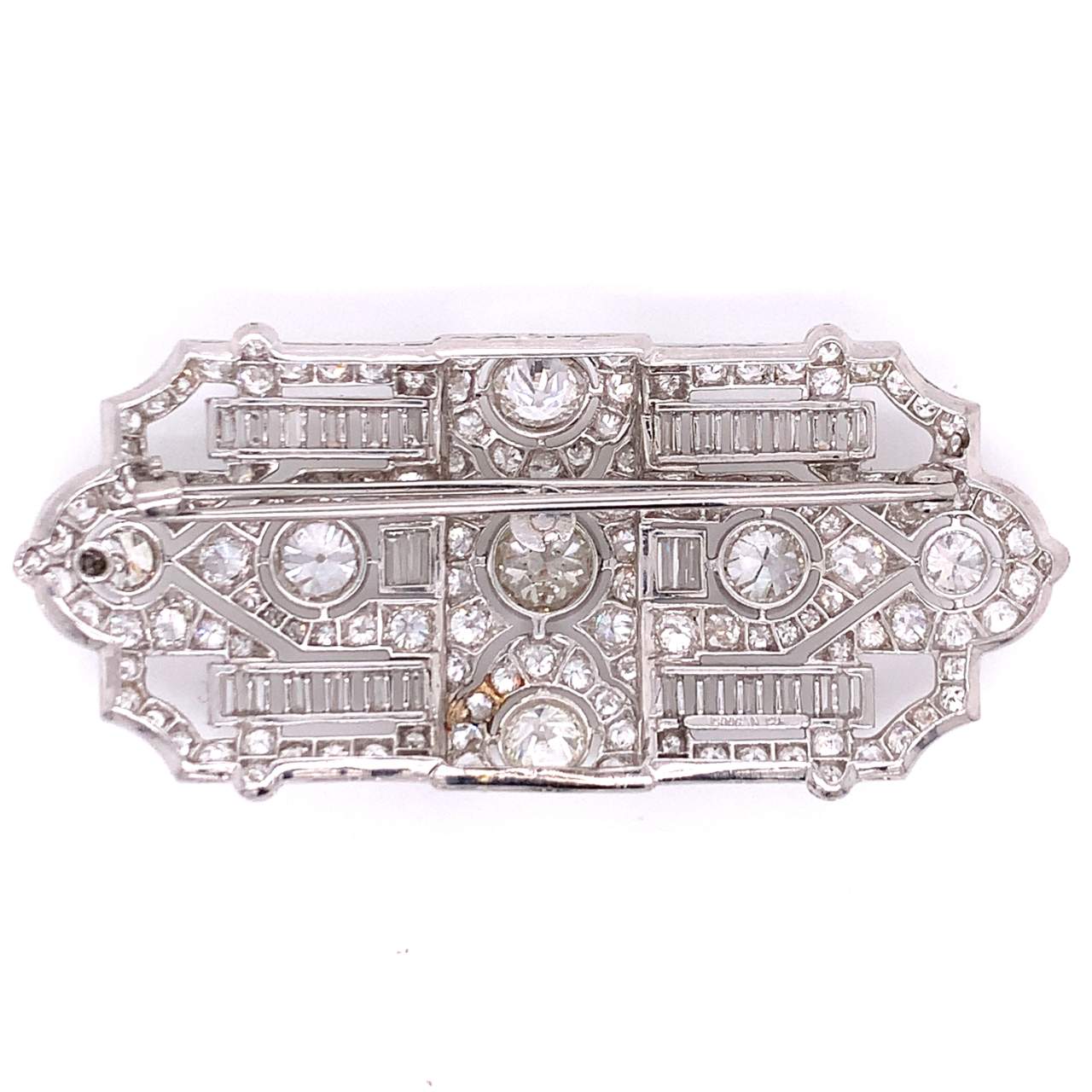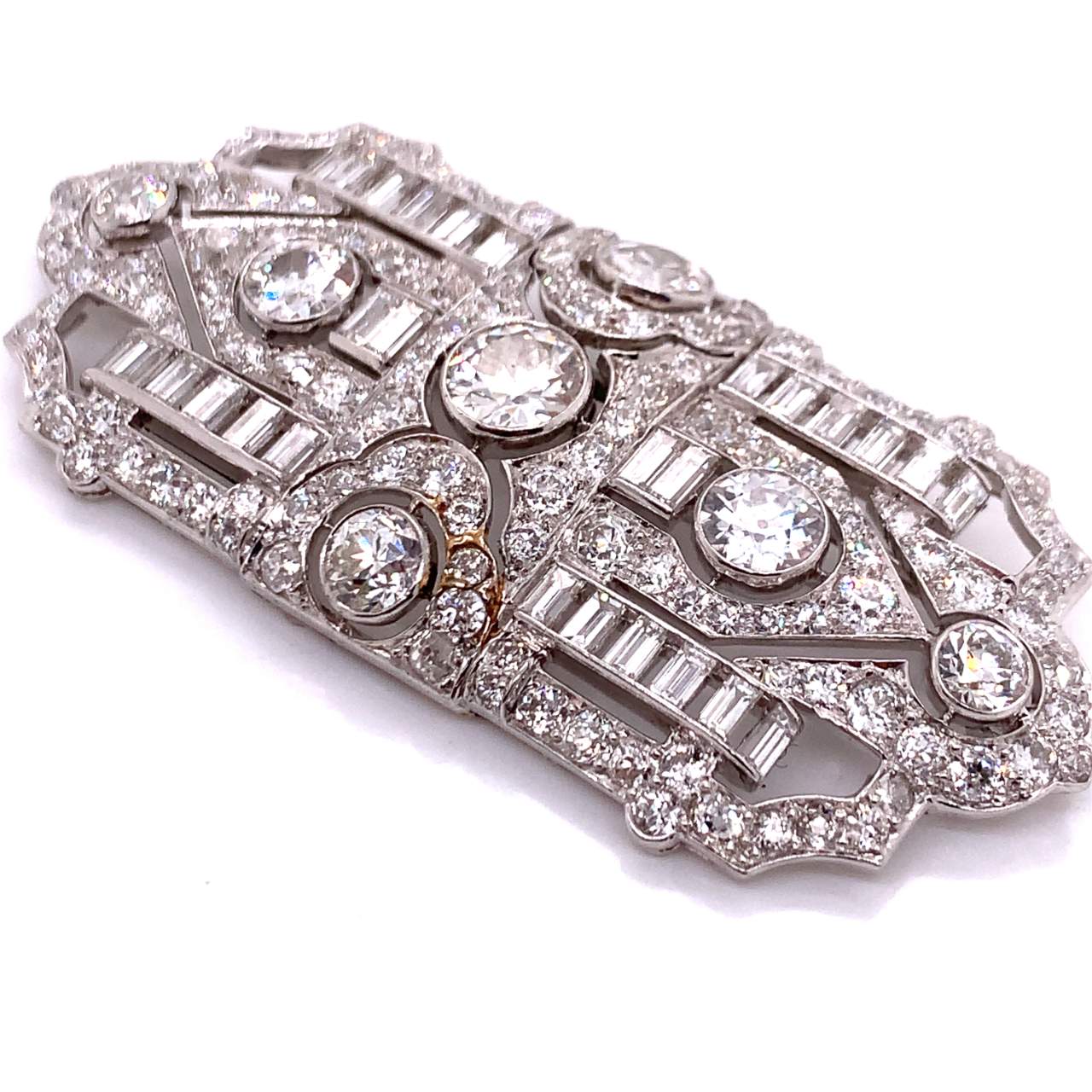 Platinum Art Deco Diamond BroochWeighing 24.6 gramsSet with 7 Old European Diamonds weighing app. 6.05 Ct.Along with 28 Baguette Diamonds weighing app 3.50 Ct.And 132 Old European Diamonds weighing 5.00 Ct.App. 2.5 inches in length