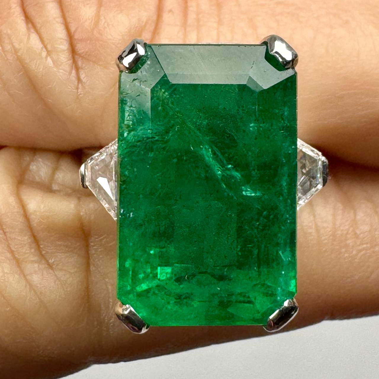 Beautiful Emerald Approx. 12.00 CtsMounted with 2 Trapezoid Diamonds Weighing Approx. .90 CtG-H Color VS2-SI1 ClarityRing Size 7Platinum, weighs 10.10 gms