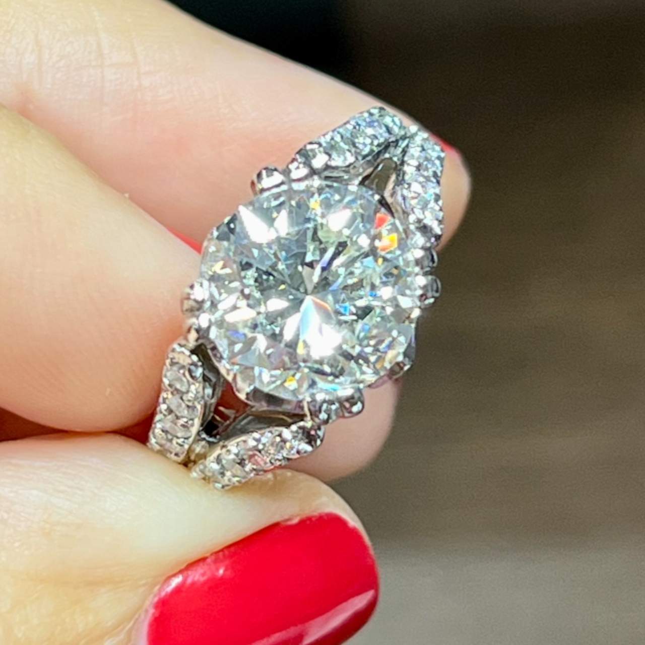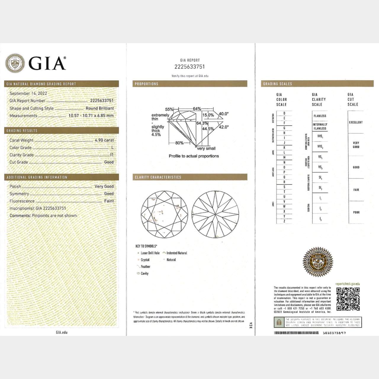 Platinum 4.90 Ct. GIA Certified Diamond Ring Weighing 15.0 grams Set with a GIA Certified 4.90 Ct. Round Brilliant Diamond L Color, I1 Clarity 10.57 – 10.71 x 6.85mm GIA #2225633751