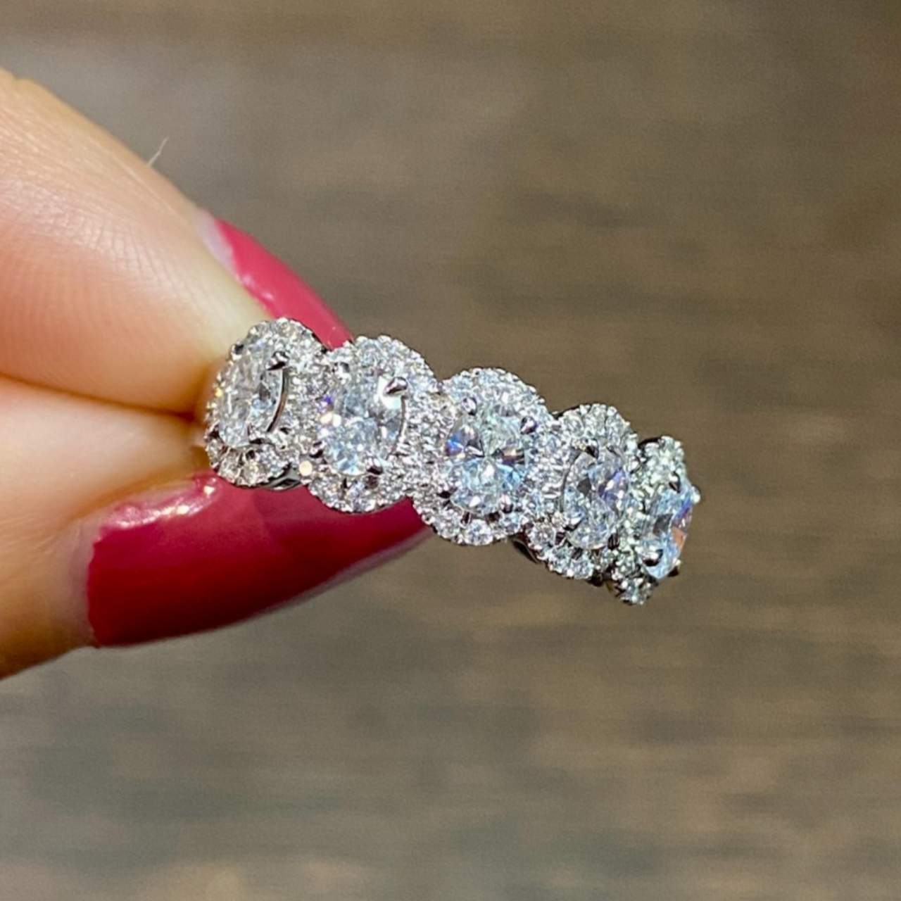 14K White Gold 1.65 Ct. Diamond Anniversary BandWeighing 5.4 gramsSet with 5 Diamonds weighing app. 1.25 Ct.G-H Color, VS1-SI1 ClarityAlong with 58 Diamonds weighing app. 0.40 Ct.G-H Color, VS1-SI1 ClarityRing Size 6.75